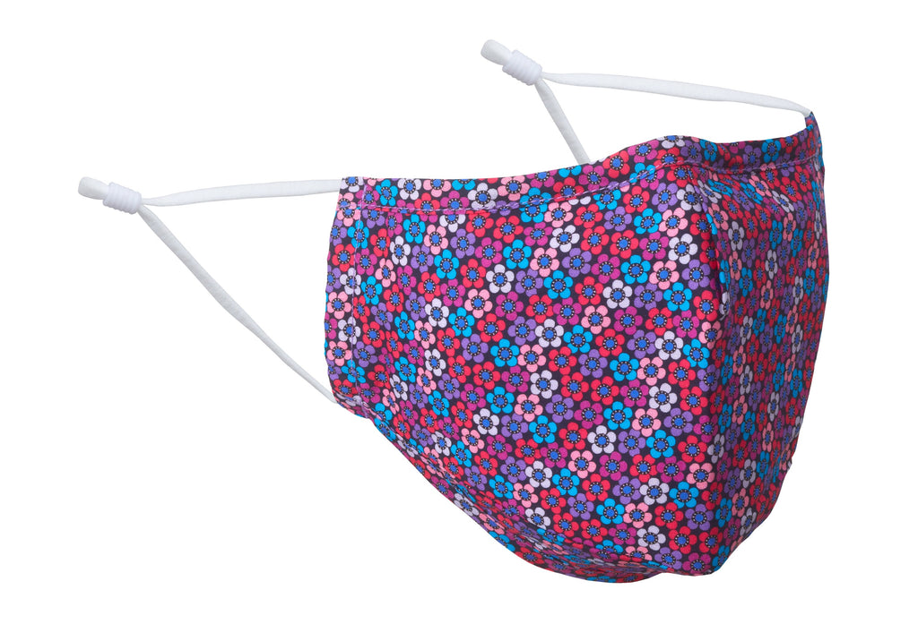 Attract some positive attention when you don this all-cotton, triple-layer face mask with its beautiful blue and pink floral design on black.