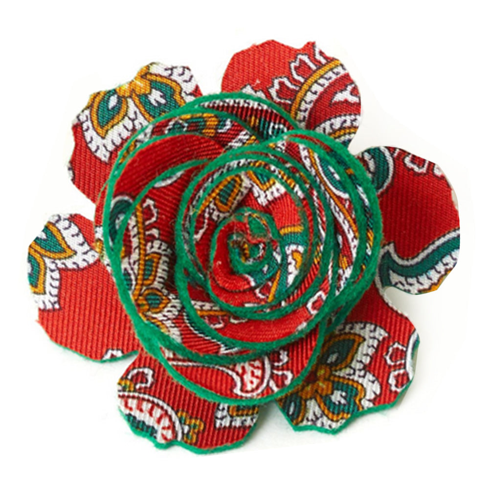 This cheerful boutonniere will not wilt or fade after you've tucked it into your lapel. A festive shade red silk twill dances with paisley shapes of red, green and gold backed with kelly green hand cut yellow wool felt, and finished with a pin to anchor it to your jacket.