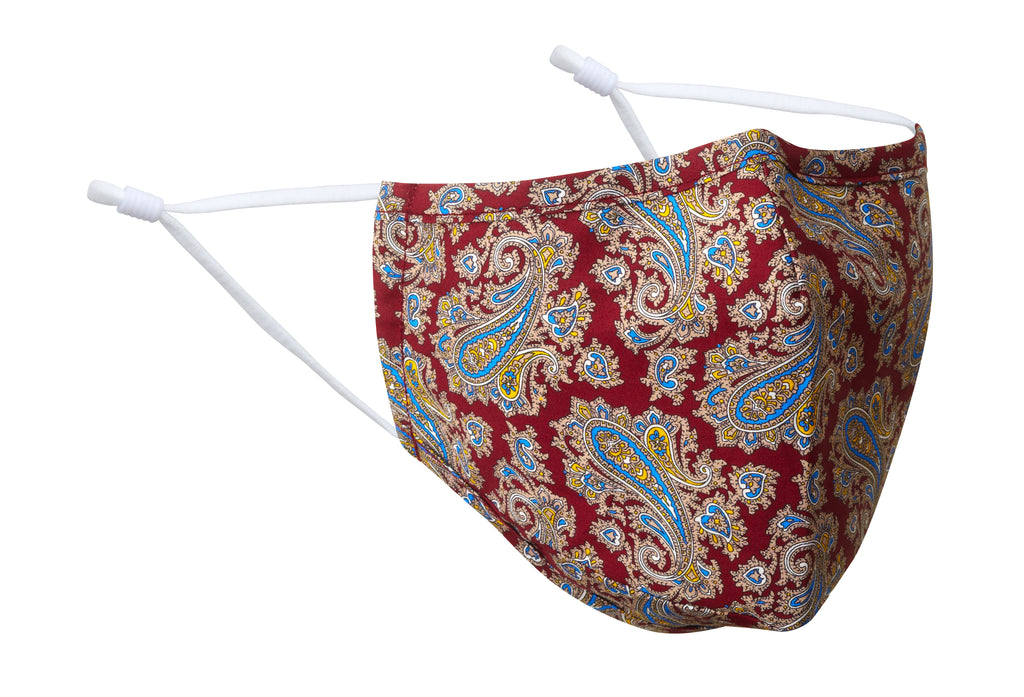 This wine-red cotton face mask hosts big blue and yellow paisleys bordered with earthy brown flourishes. Top-notch choice!