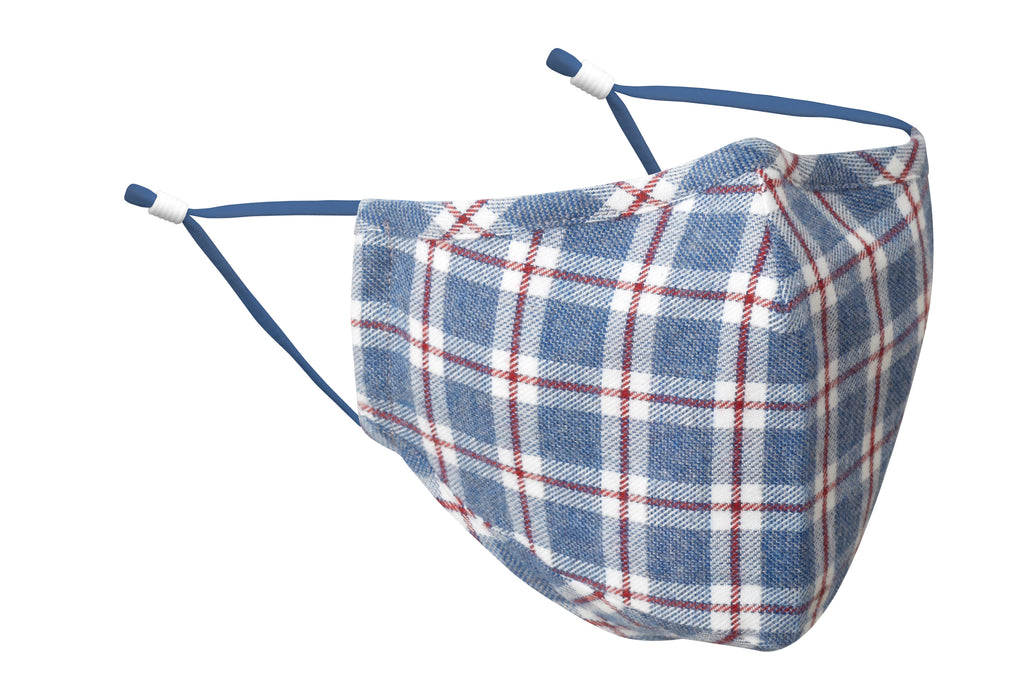 A most appealing blue and wine-red plaid is woven in white cotton flannel in this cozy face mask.