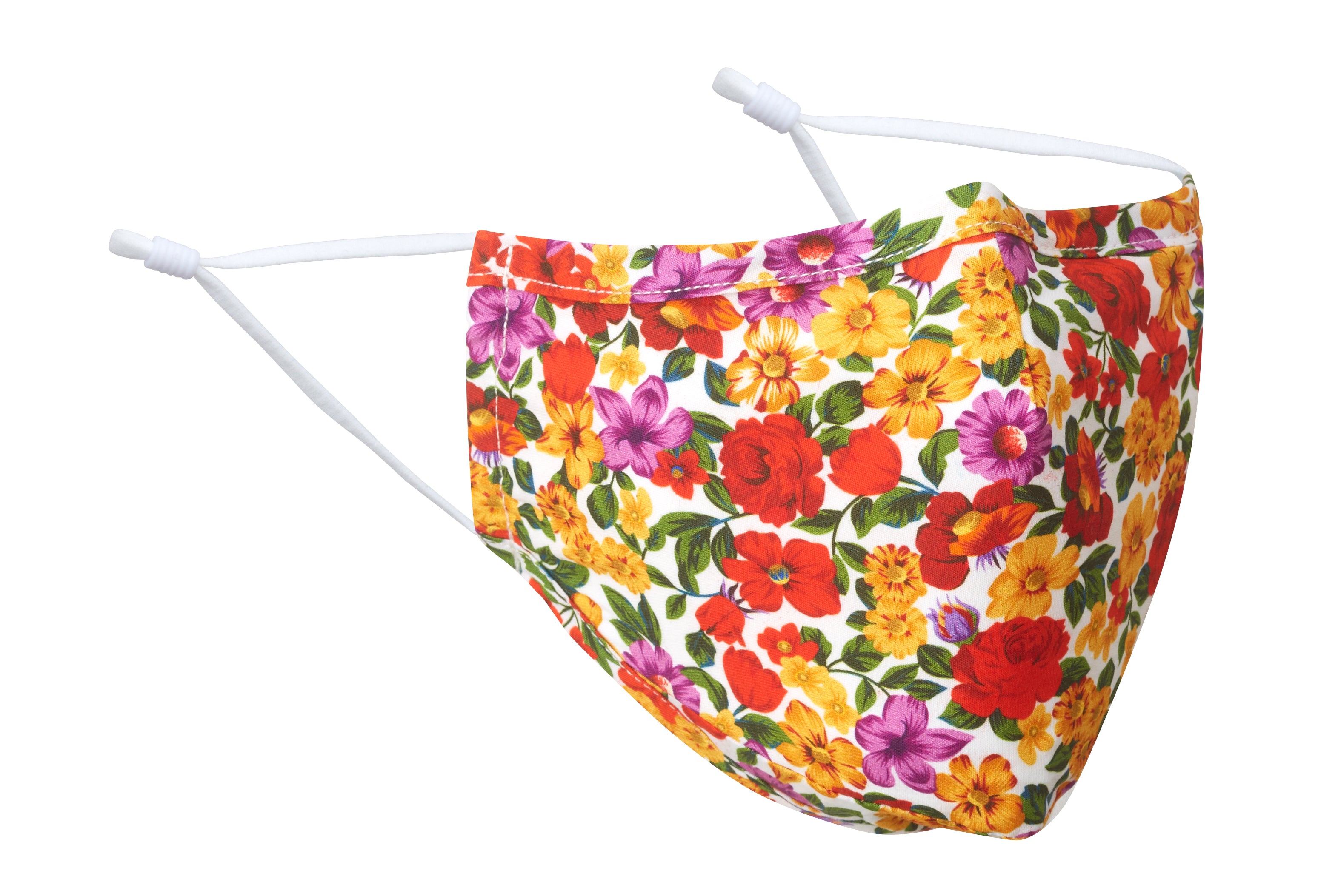 Wearing this white cotton face mask and its lush display of fanciful red, gold and purple blooms may inspire your gardening efforts this year!