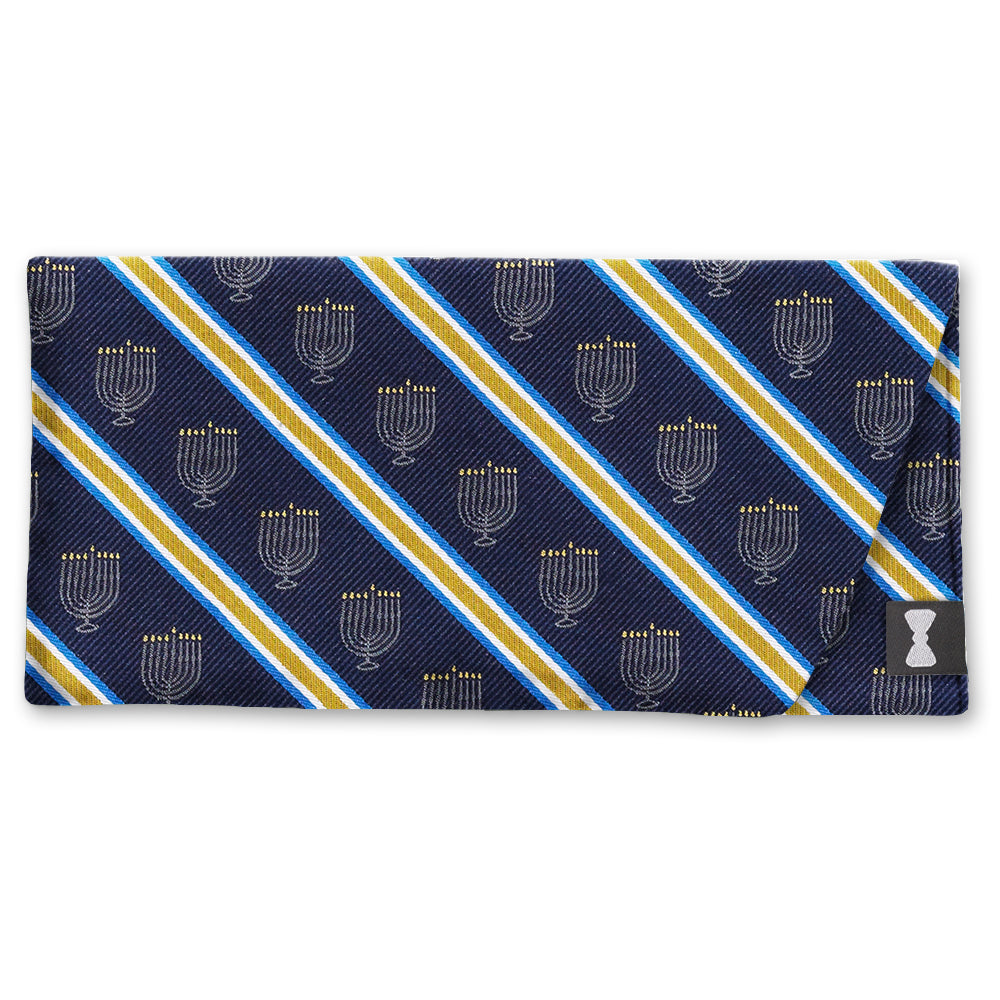 Traditional nine-branched candelabra - Hanukkah menorah - are woven in navy blue silk between textured bands of blue, white, and gold to celebrate the Festival of Lights.