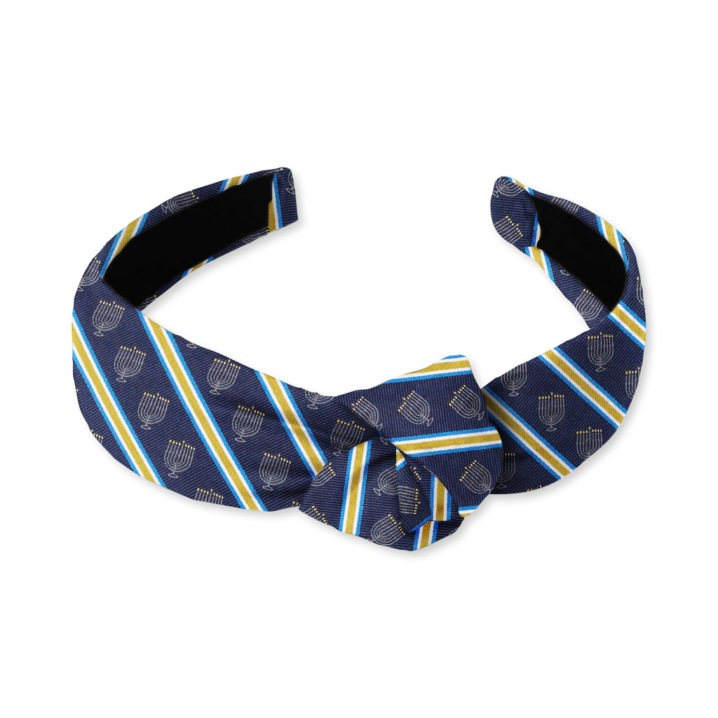 Traditional nine-branched candelabra - Hanukkah menorah - are woven in navy blue silk between textured bands of blue, white, and gold to celebrate the Festival of Lights.