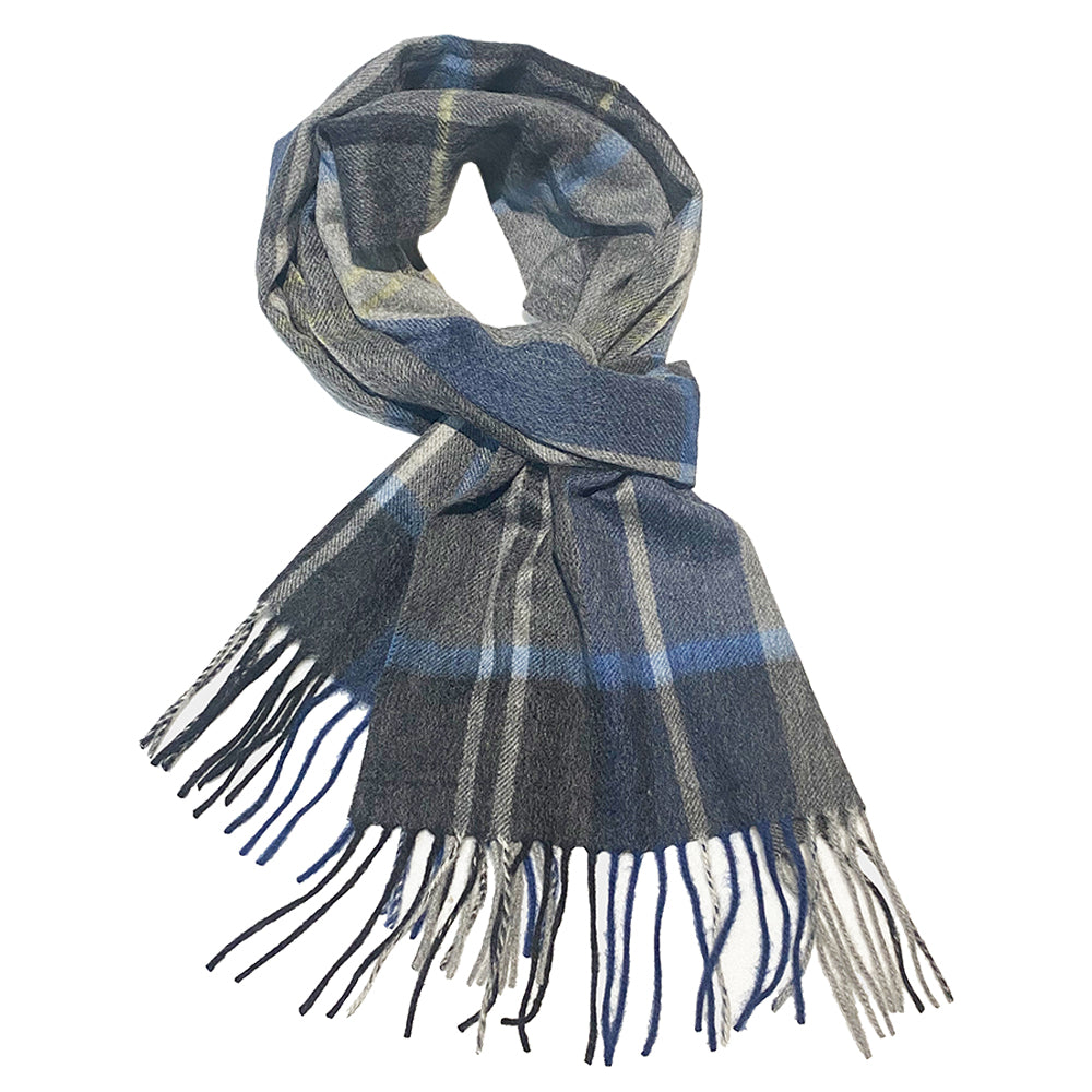 Treat yourself to this 100% cashmere scarf in a handsome plaid of black, blue and grey. Wear it with your coat to keep warm or add it to an outfit for some extra style. Regardless of your sartorial choice, this 12" x 65" fringed scarf will be a welcome addition to your winter wardrobe.