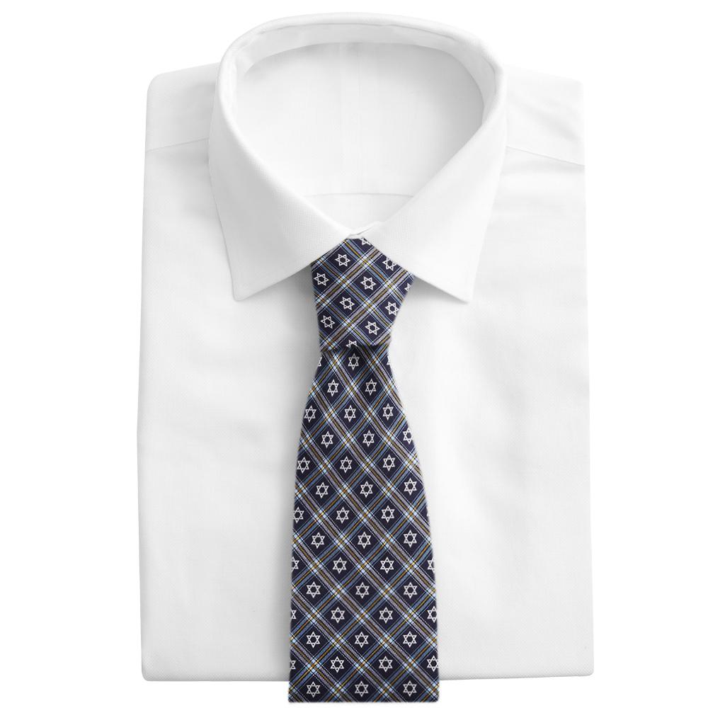 Beautifully woven in the navy blue centers of a distinguished blue, gold and white silk plaid, these traditional shields of David will take your wardrobe up several notches. L'chaim!
