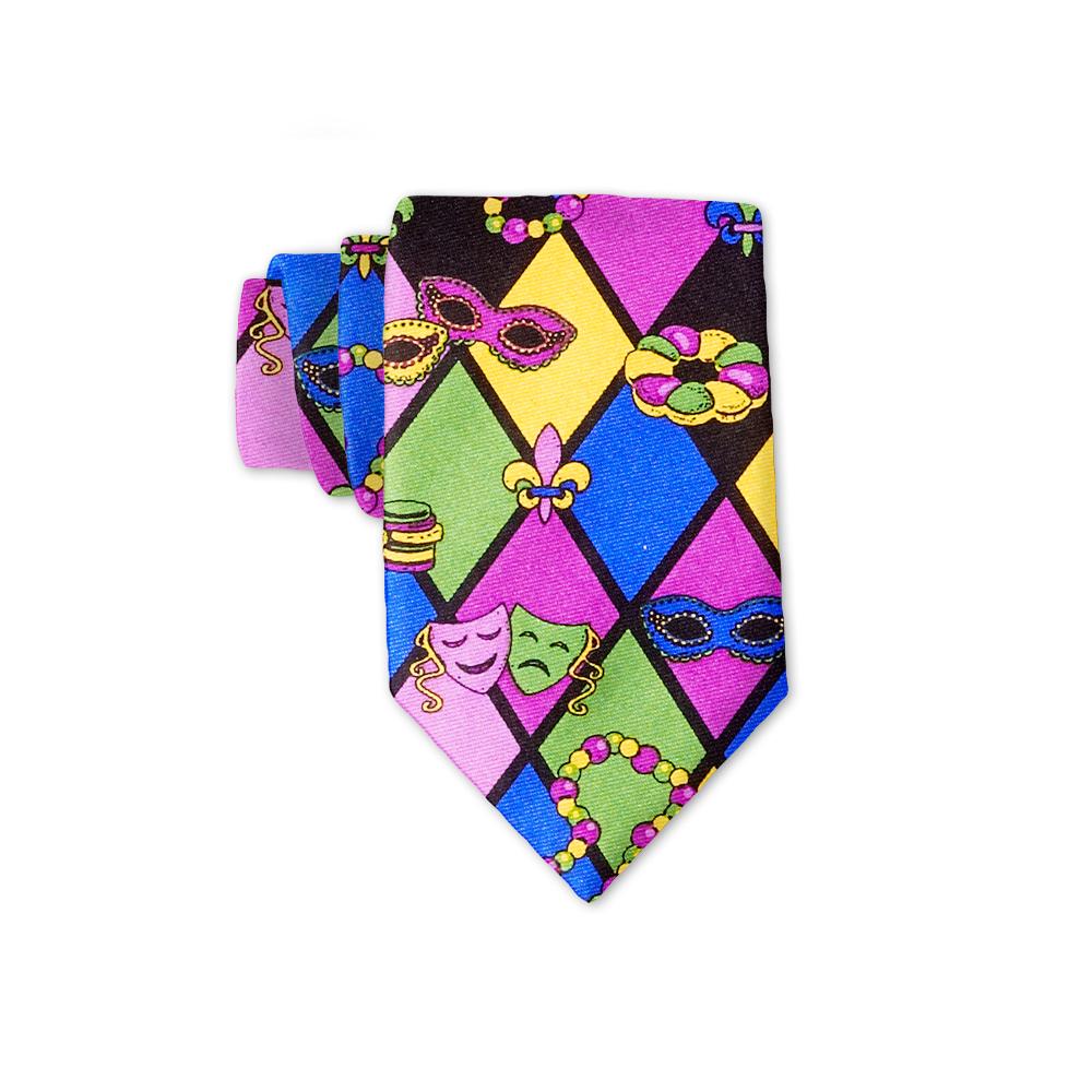Fat Tuesday traditionsincluding king cake, beads, masks, pancakes and fleurs de lisare all here, tossed in a black, blue, green, gold and purple silk twill argyle pattern. Laissez les bon temps rouler!