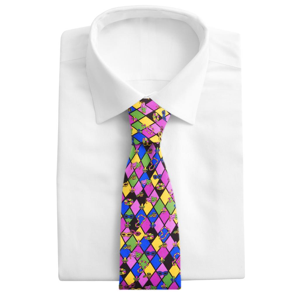 Fat Tuesday traditions including king cake, beads, masks, coins and fleurs de lis are all here, tossed in a black, blue, green, gold and purple silk twill argyle pattern. Laissez les bon temps rouler!