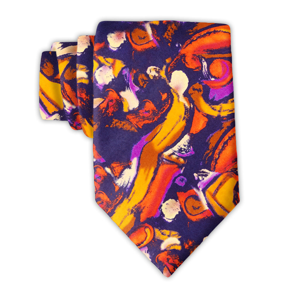 This beautiful abstract design in shades of orange and purple on a deep navy silk twill is sure to spice up your fall wardrobe.