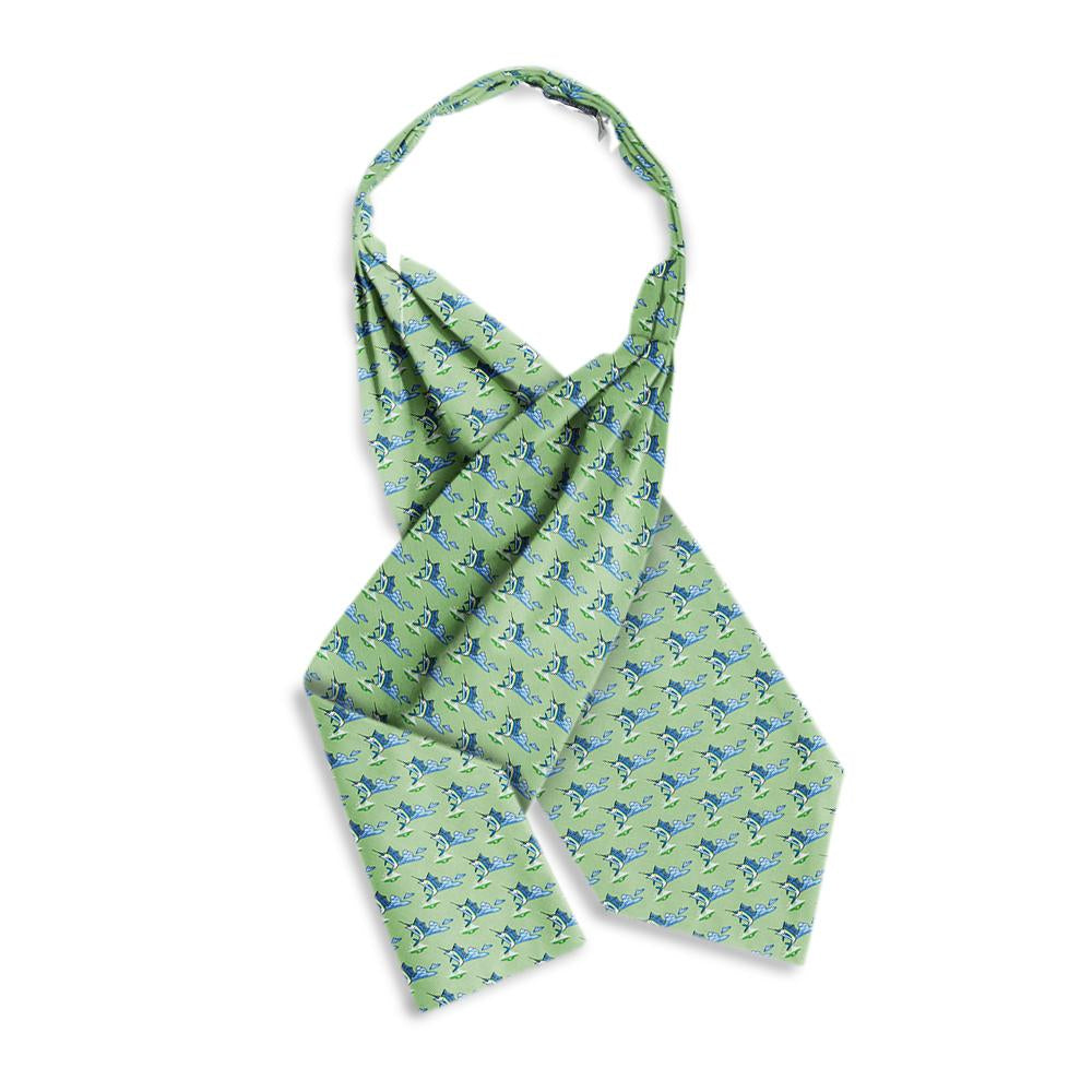 The Marlin patterned free-fold cravat features three stitched center pleats that allow luxurious drape in front without fabric bulk at the nape of your neck. It is completely reversible and sized for a perfect fit. May require a stick-pin.