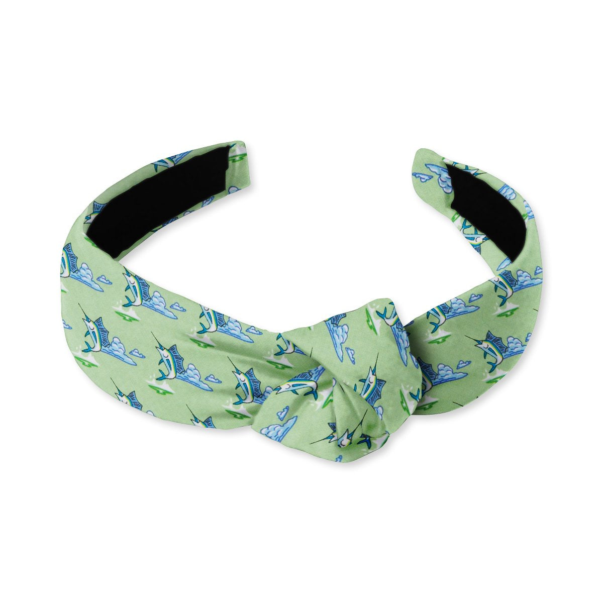 Leaping marlins on a sunny day are featured on this light green silk twill.