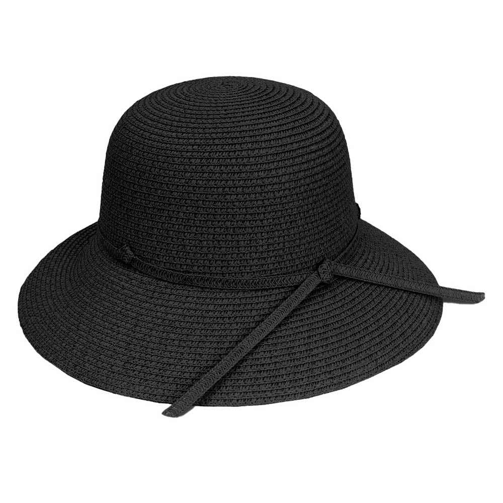 This lovely cloche-style black bucket hat with its 3-1/2" brim features a straw tied bow accent at the back.