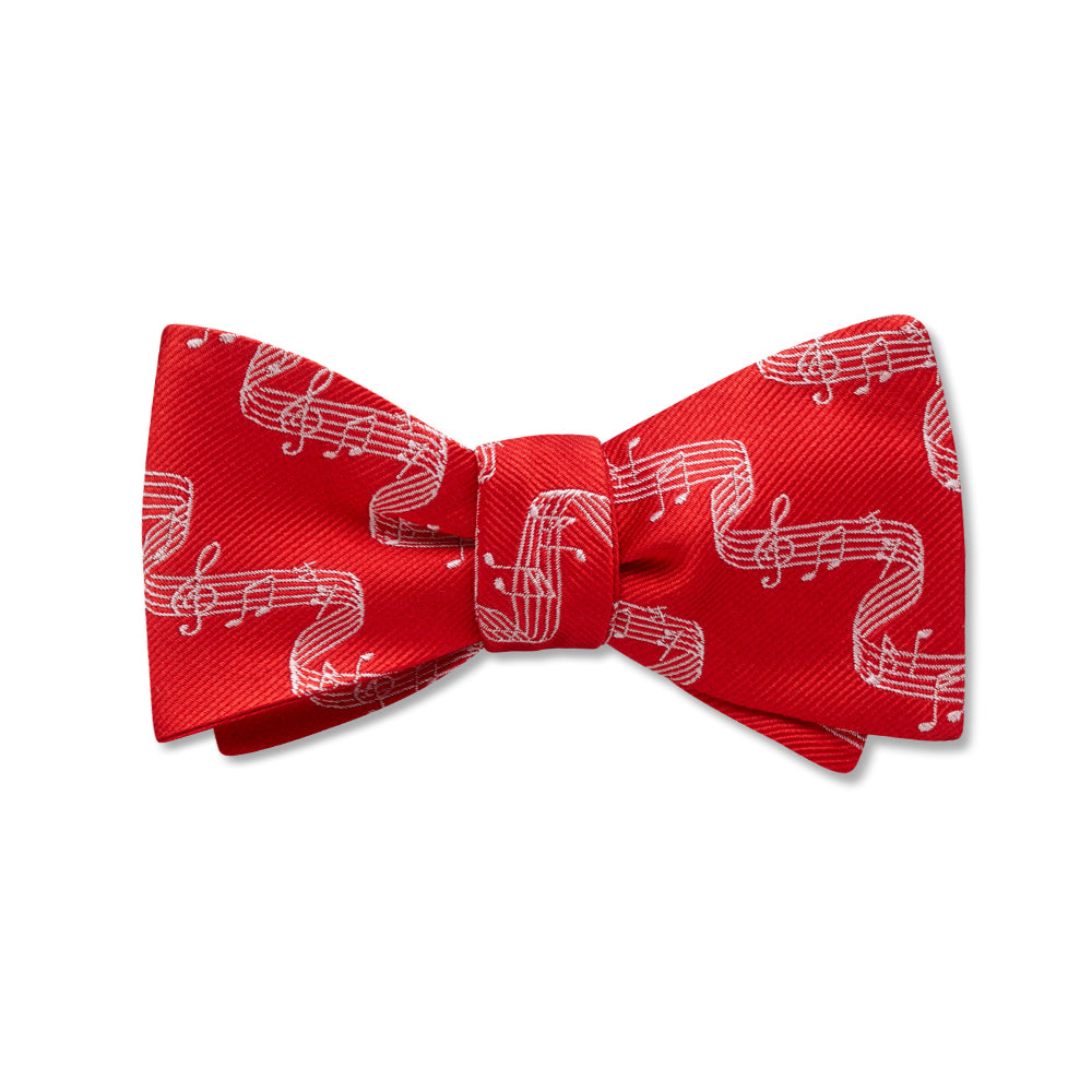 Musical notation dances on ribbons of graceful staves - all woven in a lightly ribbed shade of flag-red woven silk.
