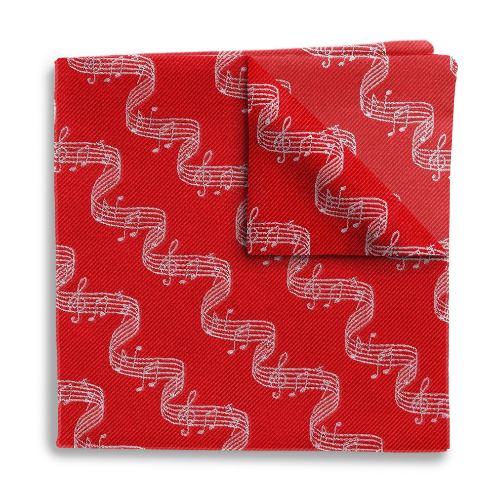 Musical notation dances on ribbons of graceful staves - all woven in a lightly ribbed shade of flag-red woven silk.