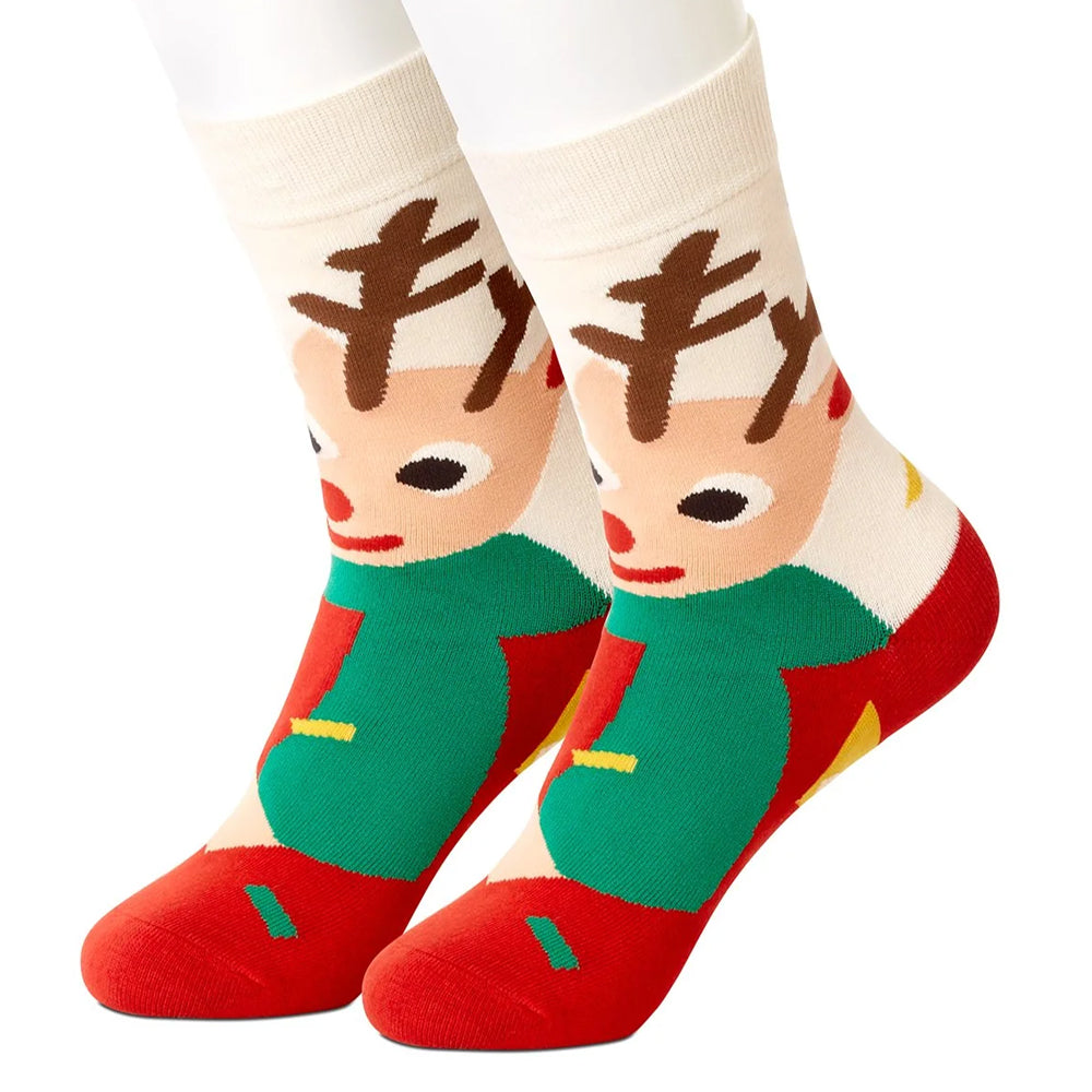 A charmingly outfitted reindeer is front and center on these white-topped and red-bottomed socks, replete with a cheerful holiday message.