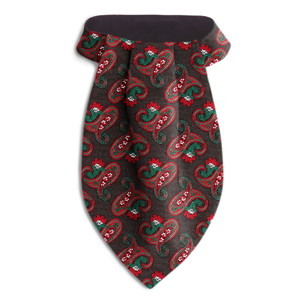 Looking for a black tie that's not just black? Here it is! This black-as-deep-space silk has red, green and white paisley and floral icons woven throughout. Beyond handsome.