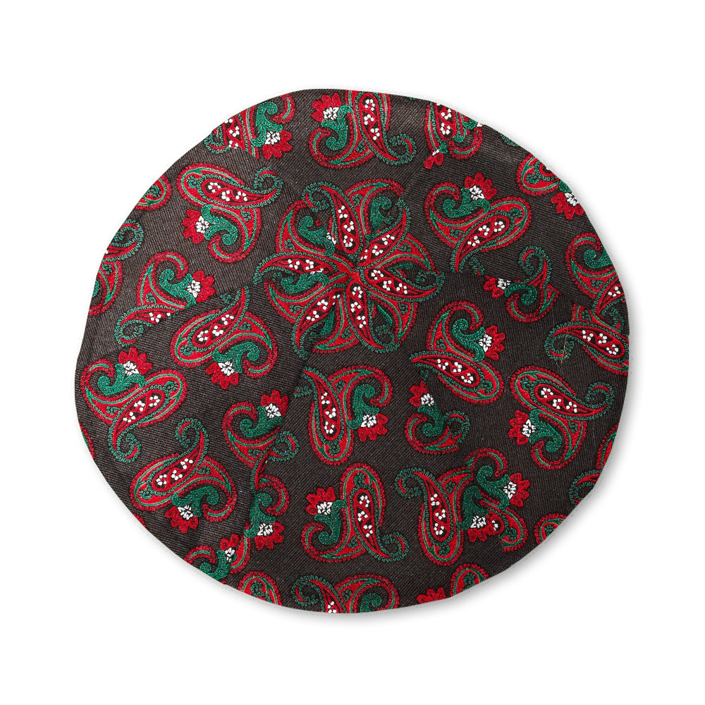 Looking for a black tie that's not just black? Here it is! This black-as-deep-space silk has red, green and white paisley and floral icons woven throughout. Beyond handsome.