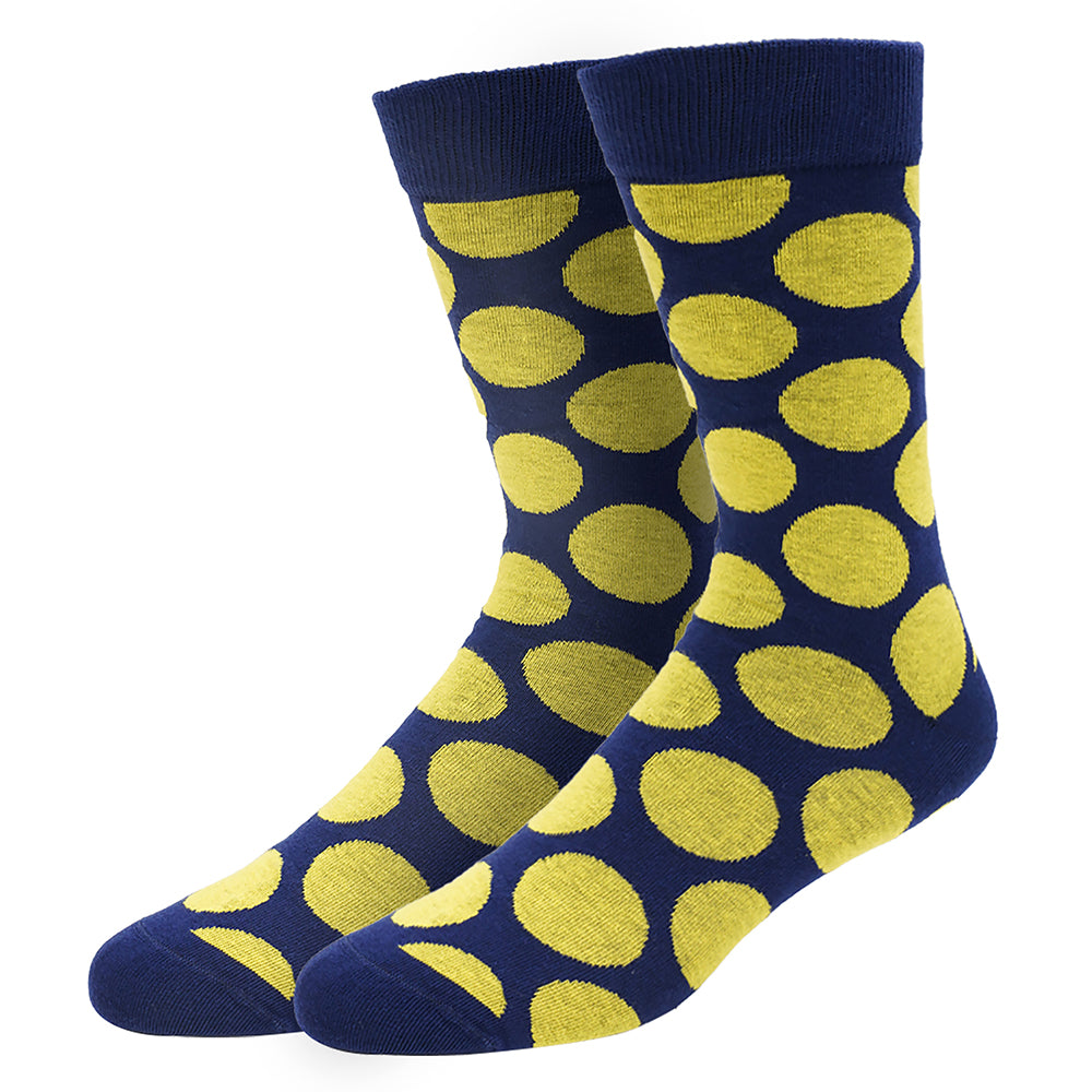 Big, bright yellow orbs woven in navy blue create an eye-catching design on these uber-polka-dotted socks.