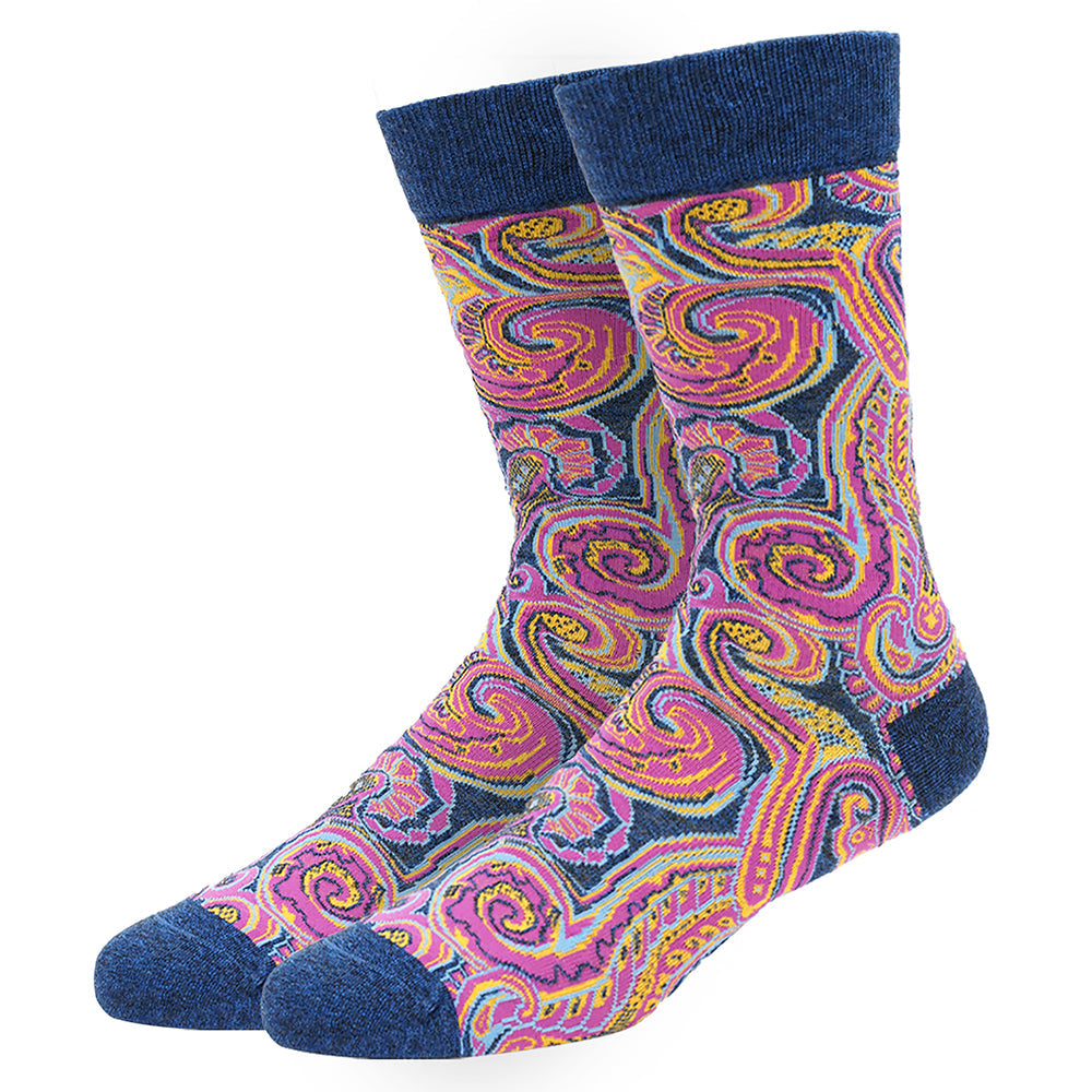Featuring a refreshing take on a paisley design, these dusky blue socks with whirls and swirls of dark pink, blue and gold will add some pizzazz to your sock drawer.