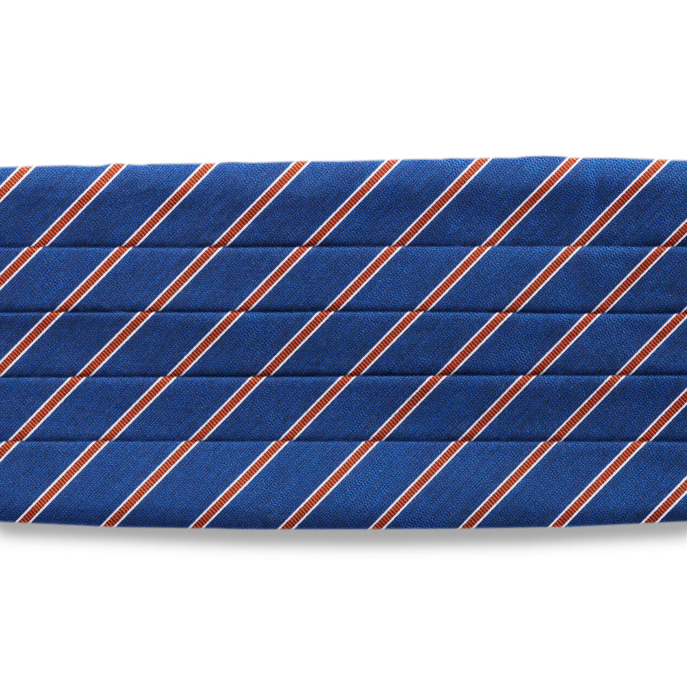 Lake blue woven silk and copper-colored ribbons with white edges combine to create a singularly appealing all-seasons stripe.
