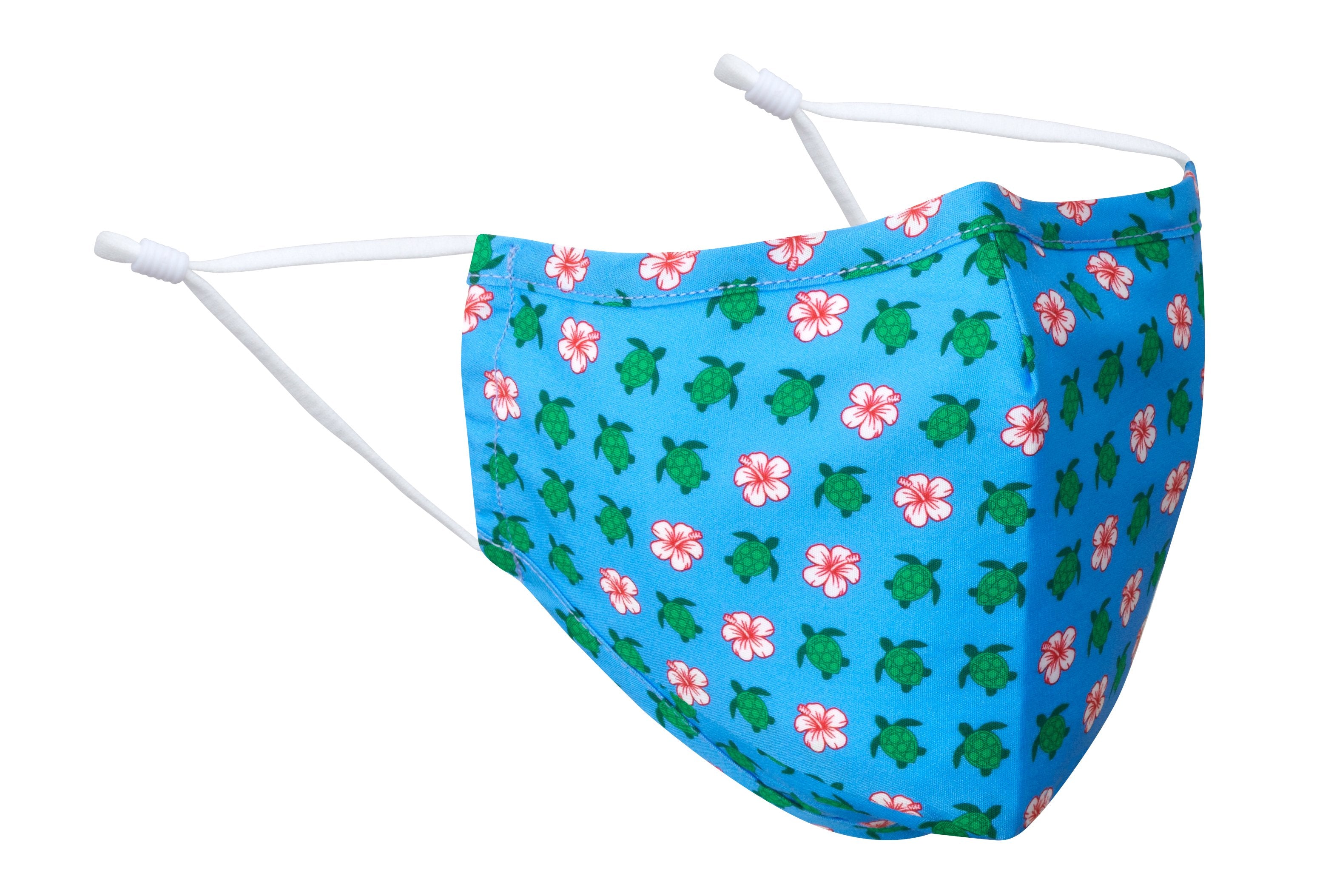 Lots of lovely green sea turtles cruise between pink-centered white hibiscus blossoms on this warm blue cotton face mask.