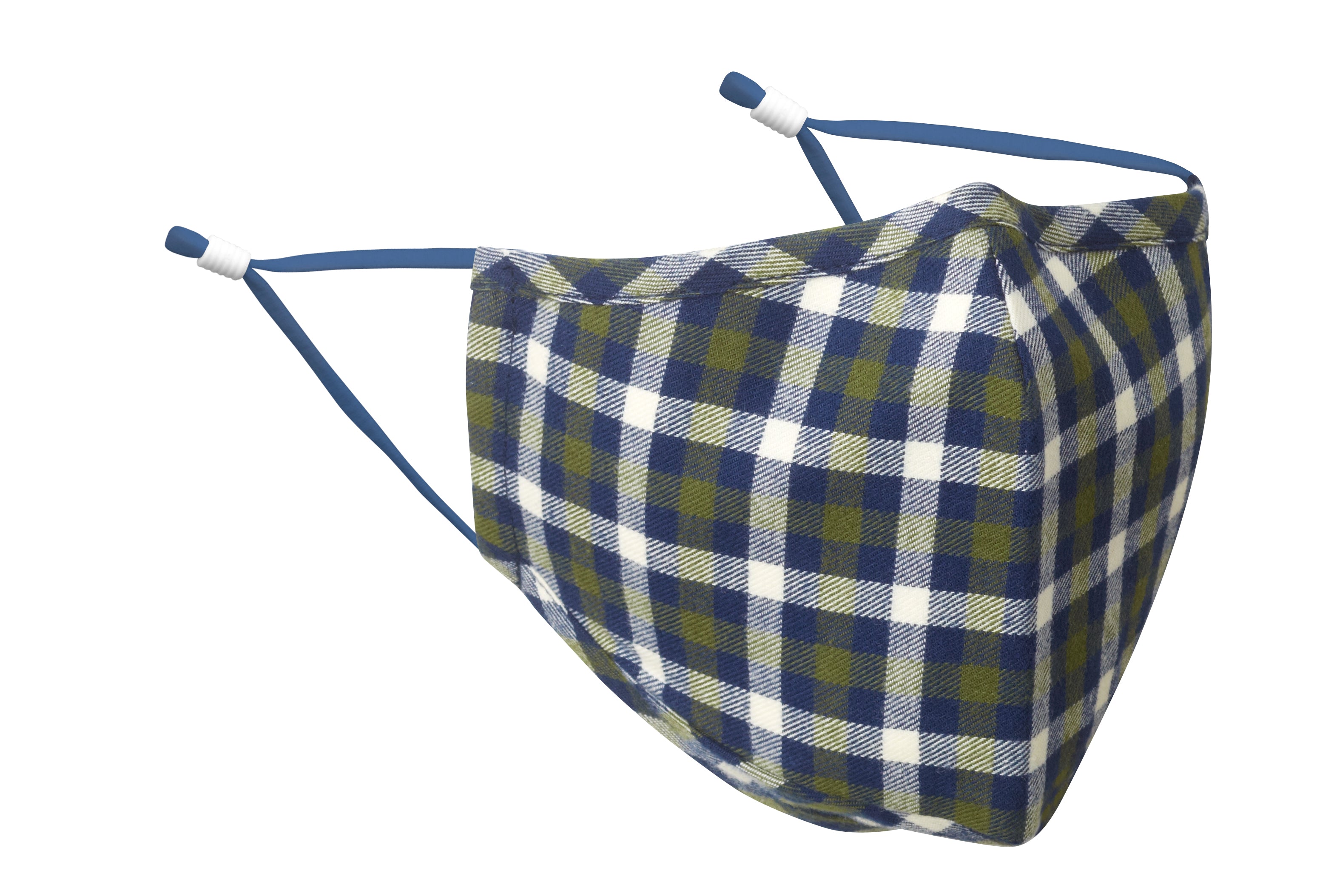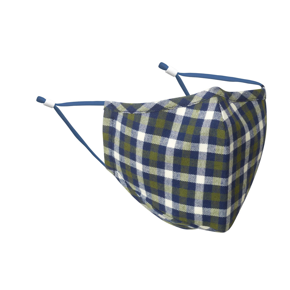 Navy blue and pine green are woven in white cotton flannel to create a handsome plaid face mask for cool-weather wear.