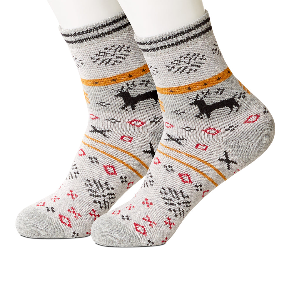 Black dancing deer are featured on these charming grey socks, with bands of geometric designs in gold, green and red above and below. A fun choice for your warm-weather wardrobe.