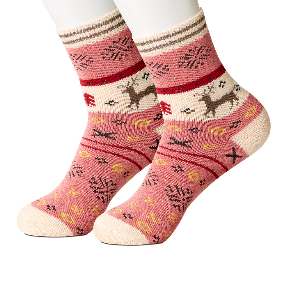 Ash grey dancing deer are featured on these charming pink socks, with bands of geometric designs in red, black and yellow above and below. A fun choice for your warm-weather wardrobe.