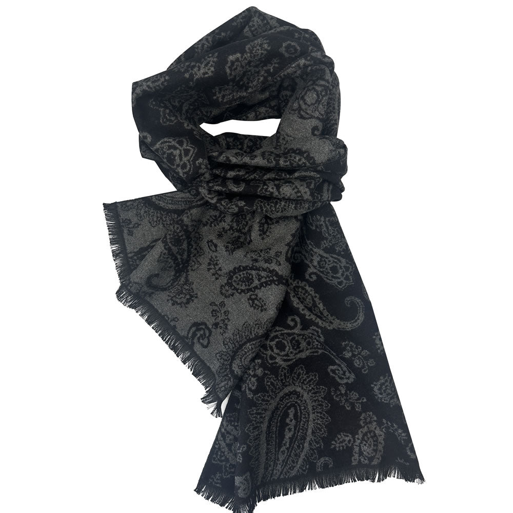 You'll never go wrong wearing this black scarf with its whirls and swirls of silver paisleys.