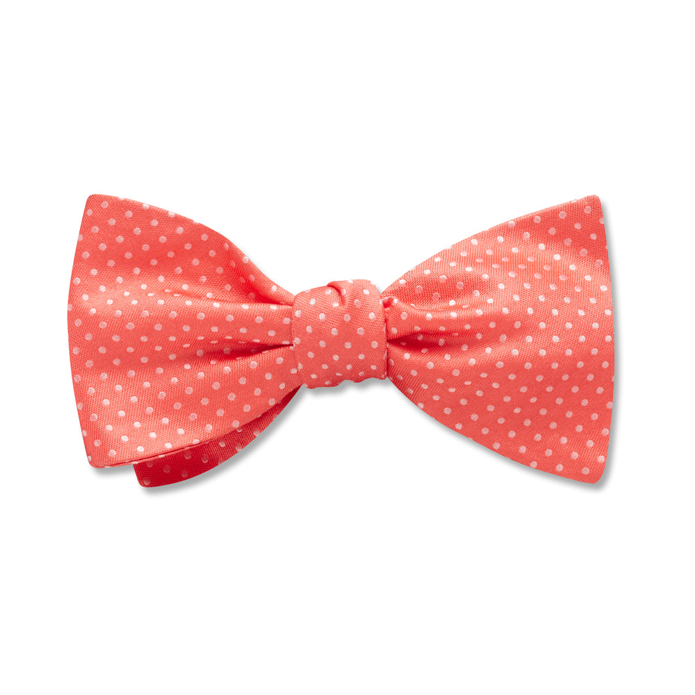 Small white polka dots add just the right flair to this wonderful woven silk tie featuring a lovely coral color that will never be out of style.