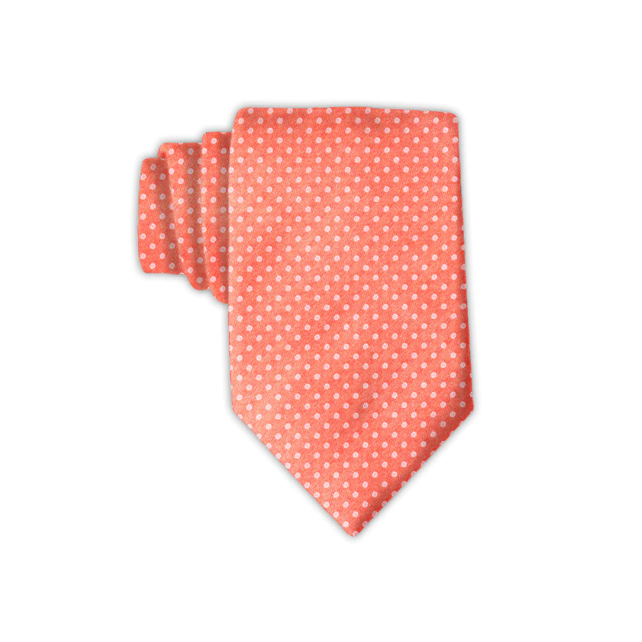 Small white polka dots add just the right flair to this wonderful woven silk tie featuring a lovely coral color that will never be out of style.