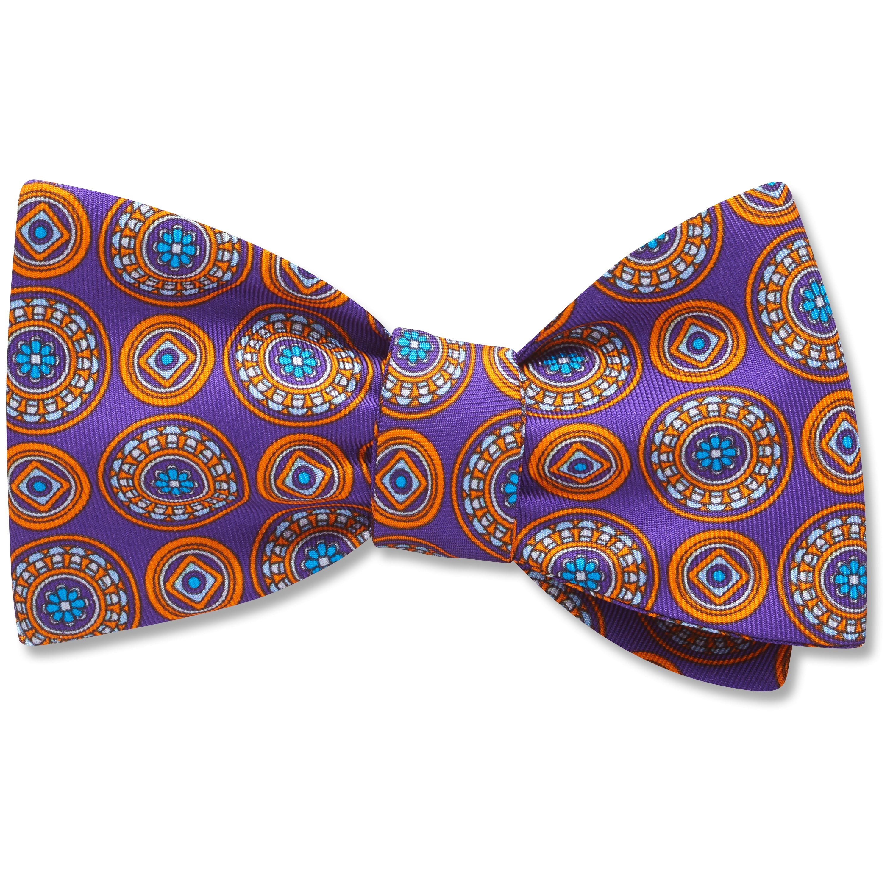 Two sizes of orange and blue medallions neatly repeat on a handsome shade of purple silk twill. A great choice for Mardi Gras gatherings - and long afterwards.