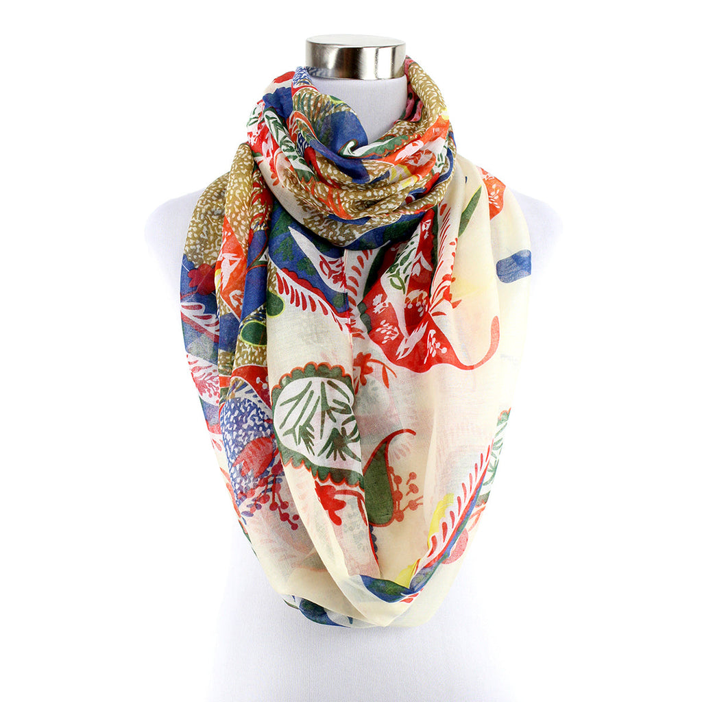 A combination of patterns in shades of red, blue green and brown swirl together on a creamy background in this glorious infinity scarf's design - bordered in pink.