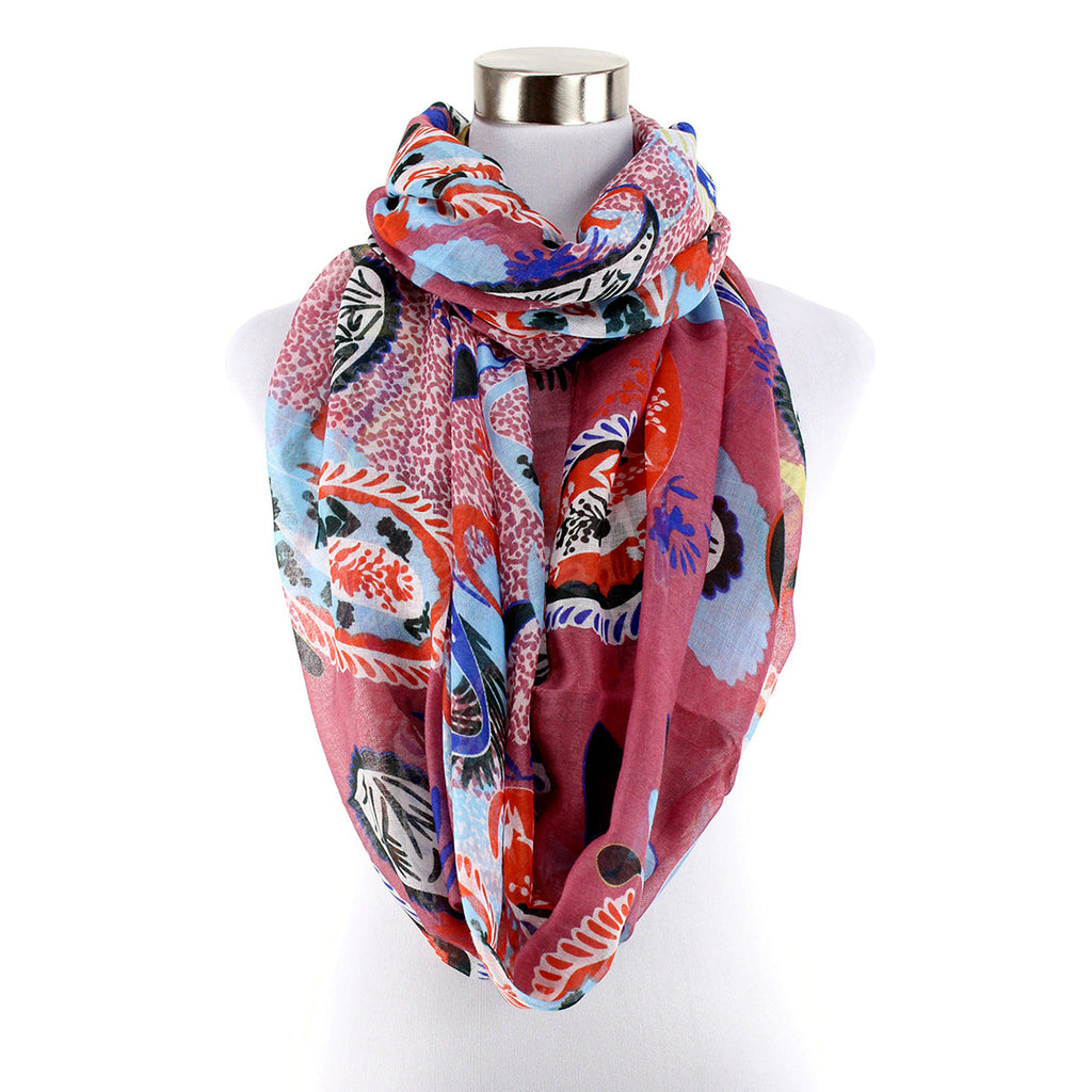 A combination of patterns in shades of blue, orange and black swirl together on a dusky red background in this glorious infinity scarf's design - bordered in brown.