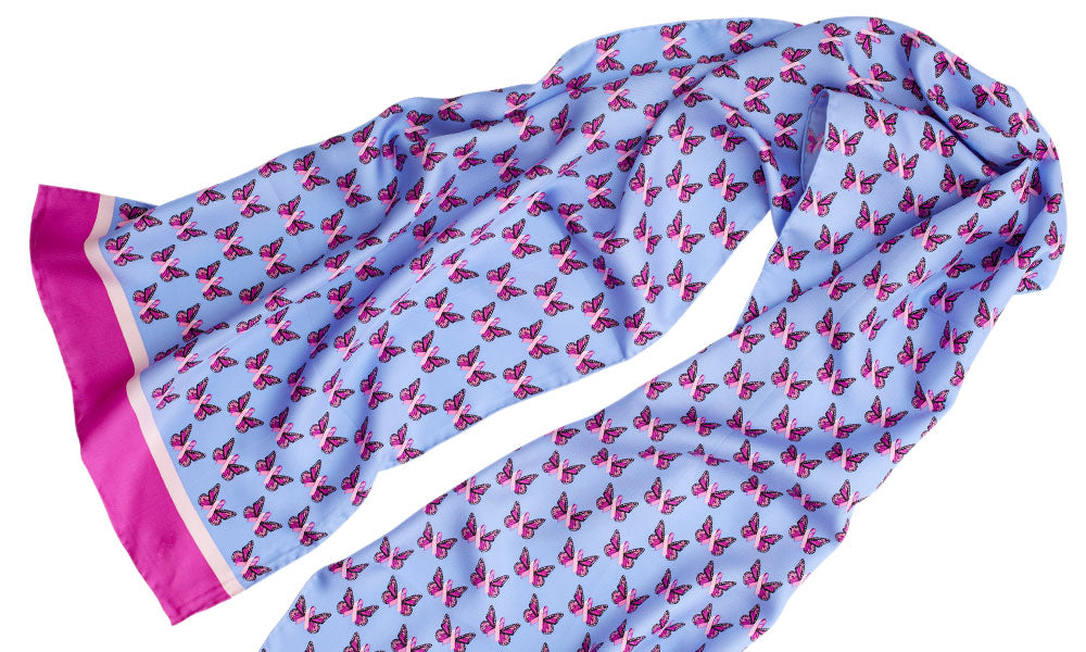 To complement our Papillon Pink bows and neckties, we created special 13.5" x 57.5" rolled-edge silk scarf featuring the same pink butterfly pattern, with ends bordered in white and dark pink.