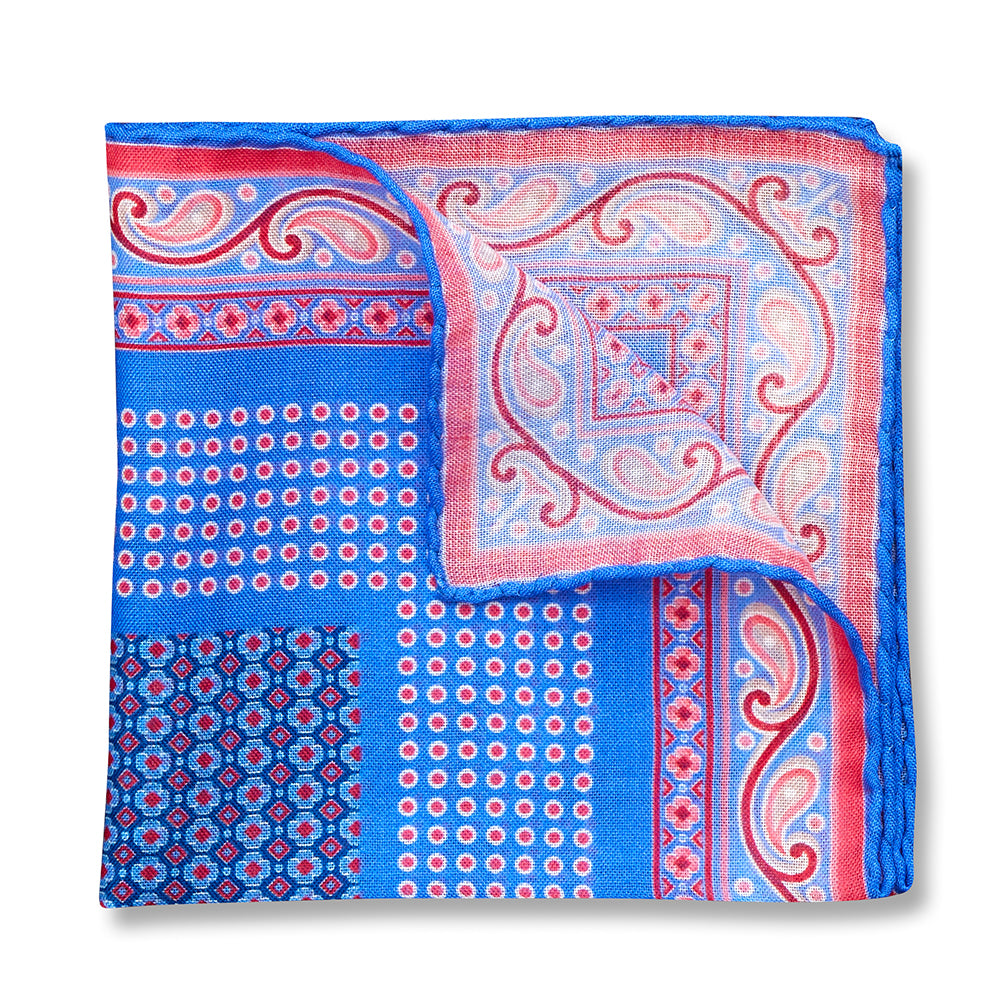 Eye-catching geometric patterns of red and blue pulse out from the center of this 12" x 12" silky-smooth Italian wool pocket square until they meet a border of red swirling paisleys and a hand-rolled bright blue hem. A great addition to your wardrobe!