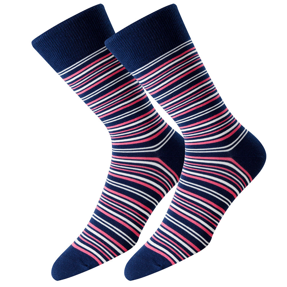 Pink, blue and shite stripes in various widths go from tip to toe in these handsome socks.