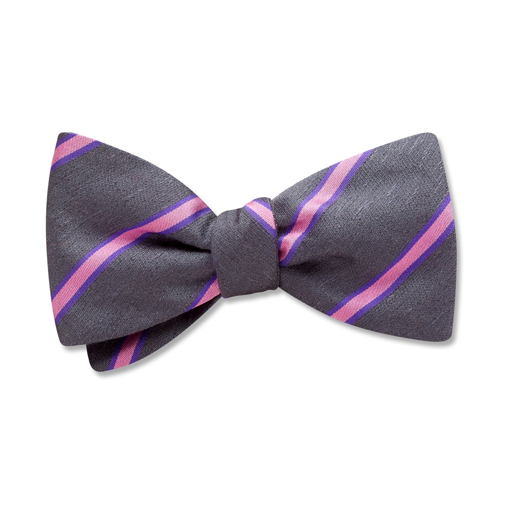 Broad swaths of slightly slubby woven silk in a standout shade of dark grey are bordered by trios of purple and pink stripes.