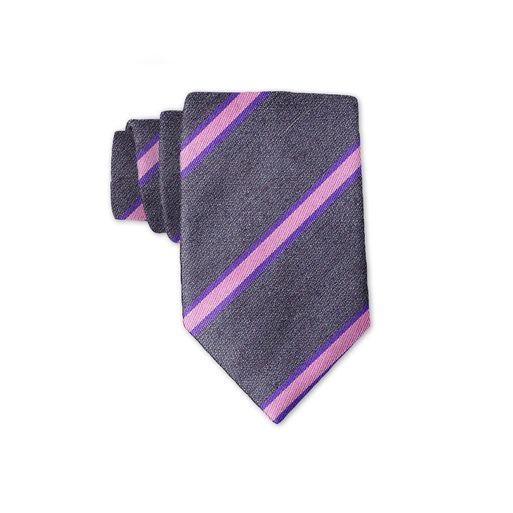 Broad swaths of slightly slubby woven silk in a standout shade of dark grey are bordered by trios of purple and pink stripes.