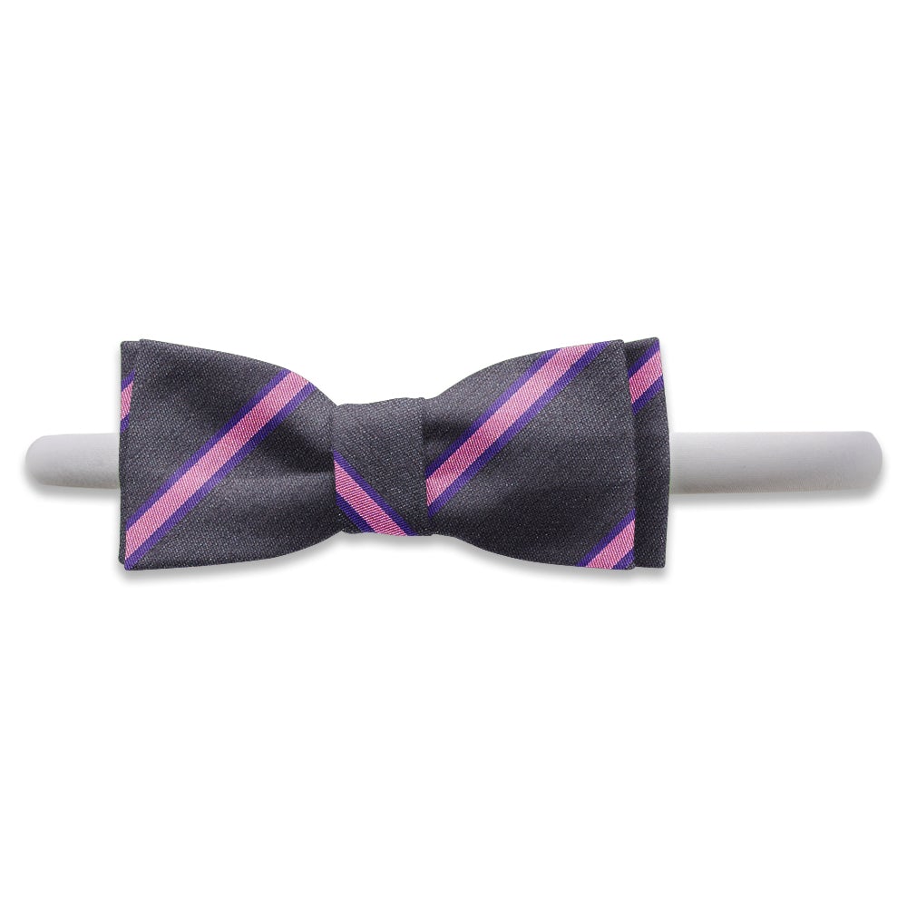 Broad swaths of slightly slubby woven silk in a standout shade of dark grey are bordered by trios of purple and pink stripes.