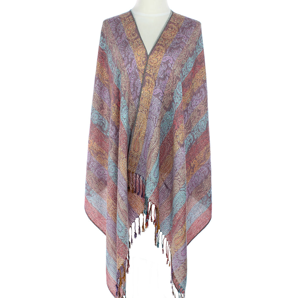 This silky soft pashmina scarf is a pleasure to behold with its bands of overlapping paisleys in soft shades of gold, pink, ivory, blue and red.