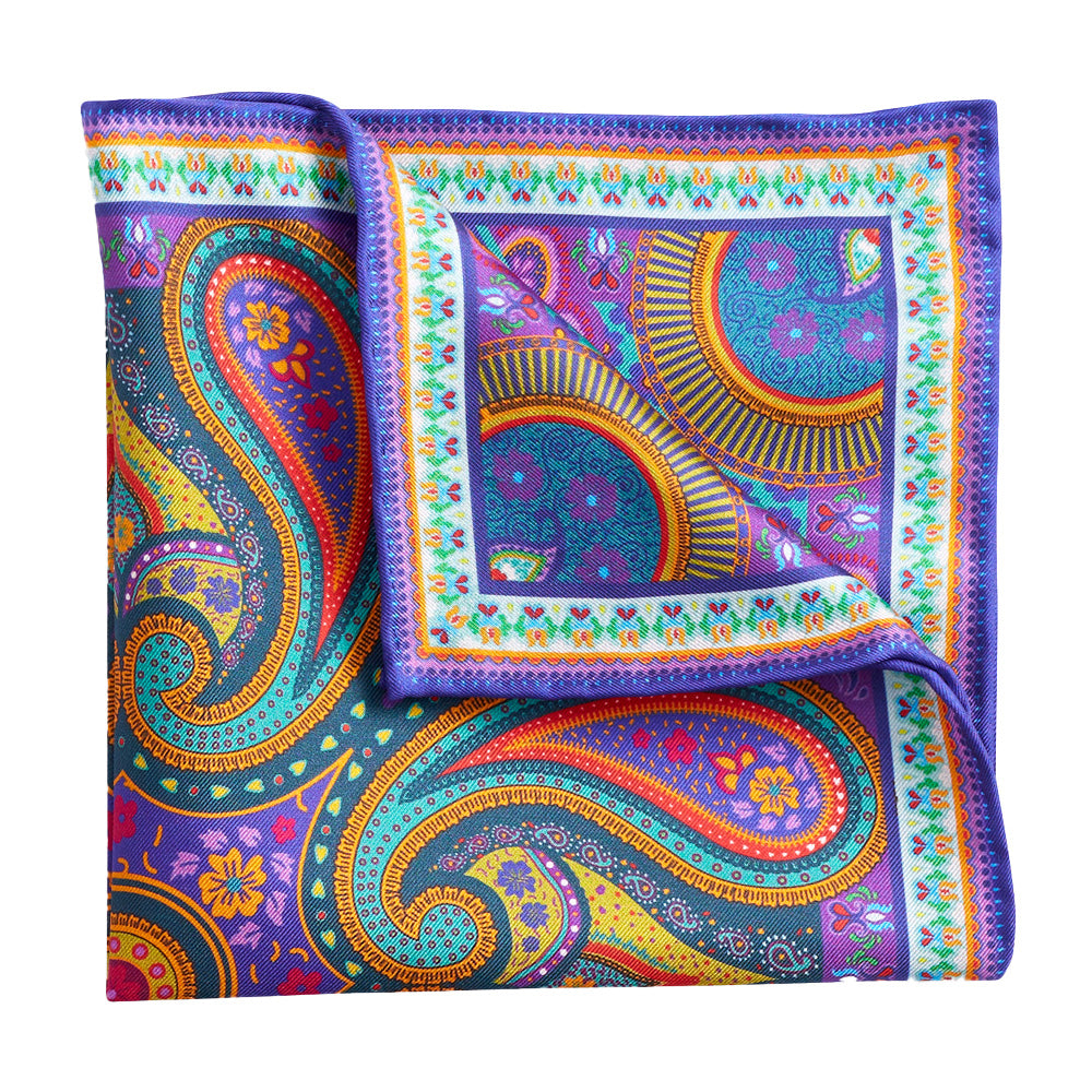 A generously-sized 13 x 13 inches, this vibrant pocket square with purple, orange and teal paisleys swirling among multi-colored floral icons is sure to catch a few eyes. The central design is bordered by rows of blue, orange and lilac, and finished with a purple hand-rolled hem.