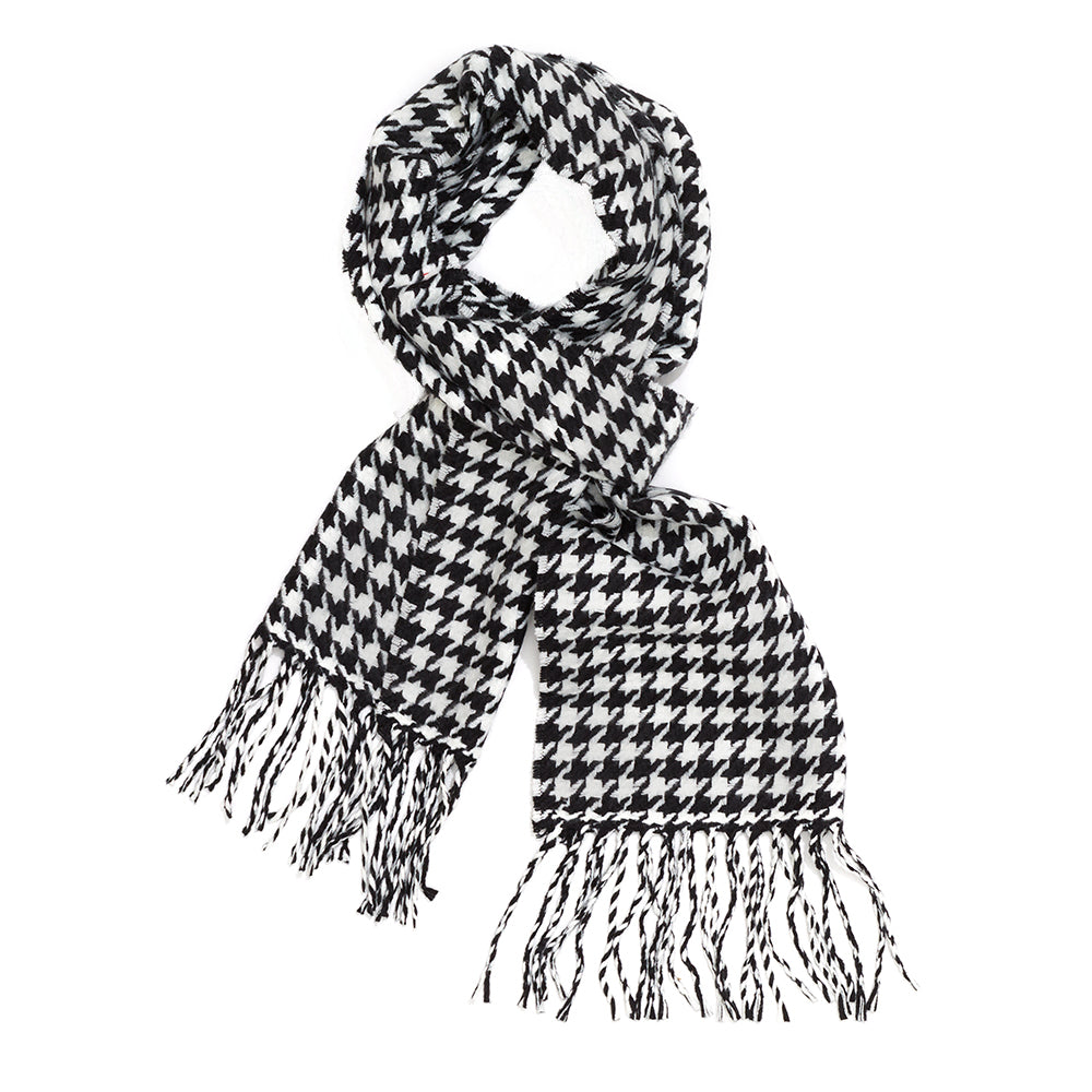 This oh-so-soft 100% cashmere scarf features a big black and white houndstooth pattern. Wear it with your coat to keep warm or add it to an outfit for some extra style. Regardless of your sartorial choice, this 12" x 72" fringed scarf will be a welcome addition to your winter wardrobe.