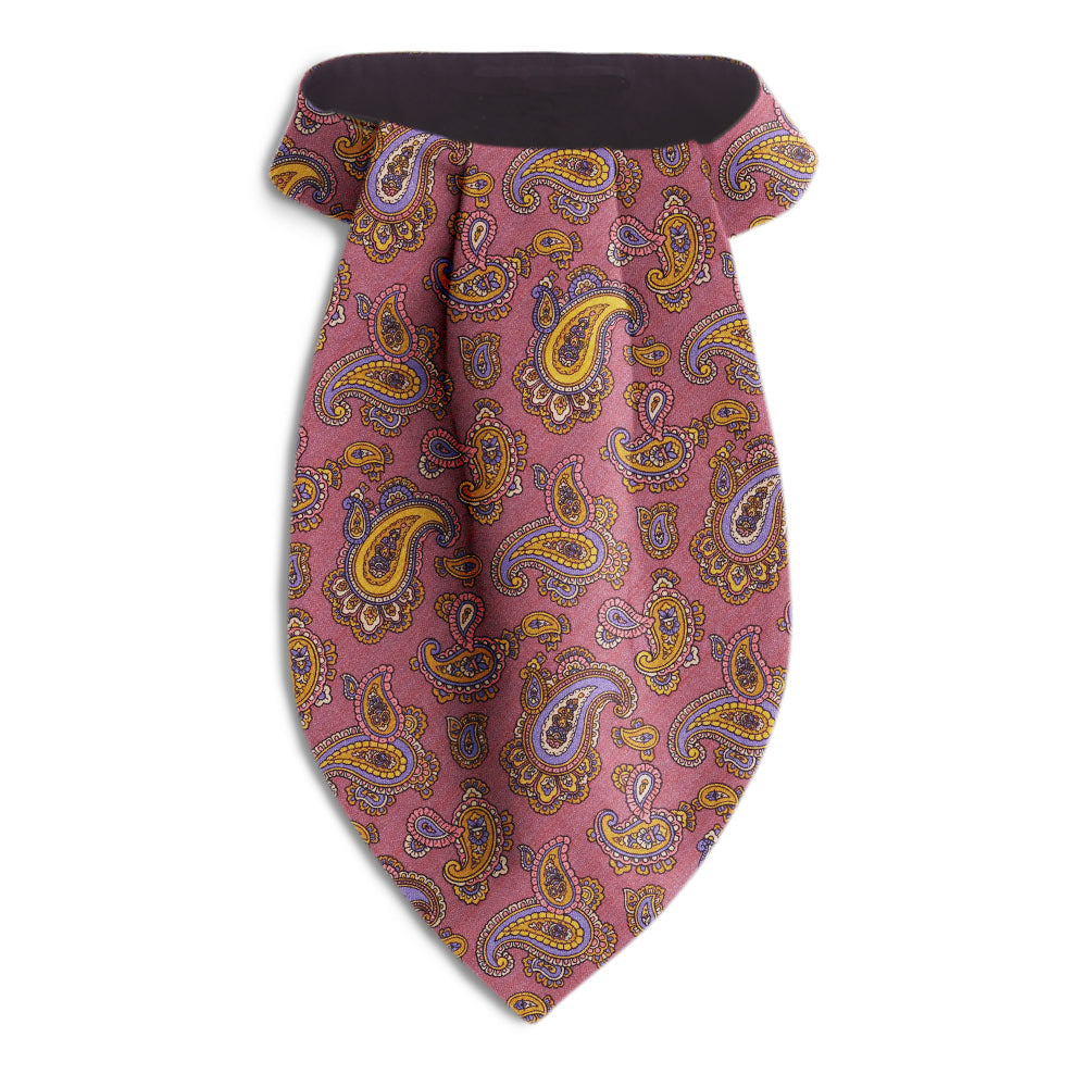 An exquisite shade of dusky pink Italian silk hosts whirls and twirls of gold, pink and blue paisleys in this lovely choice.