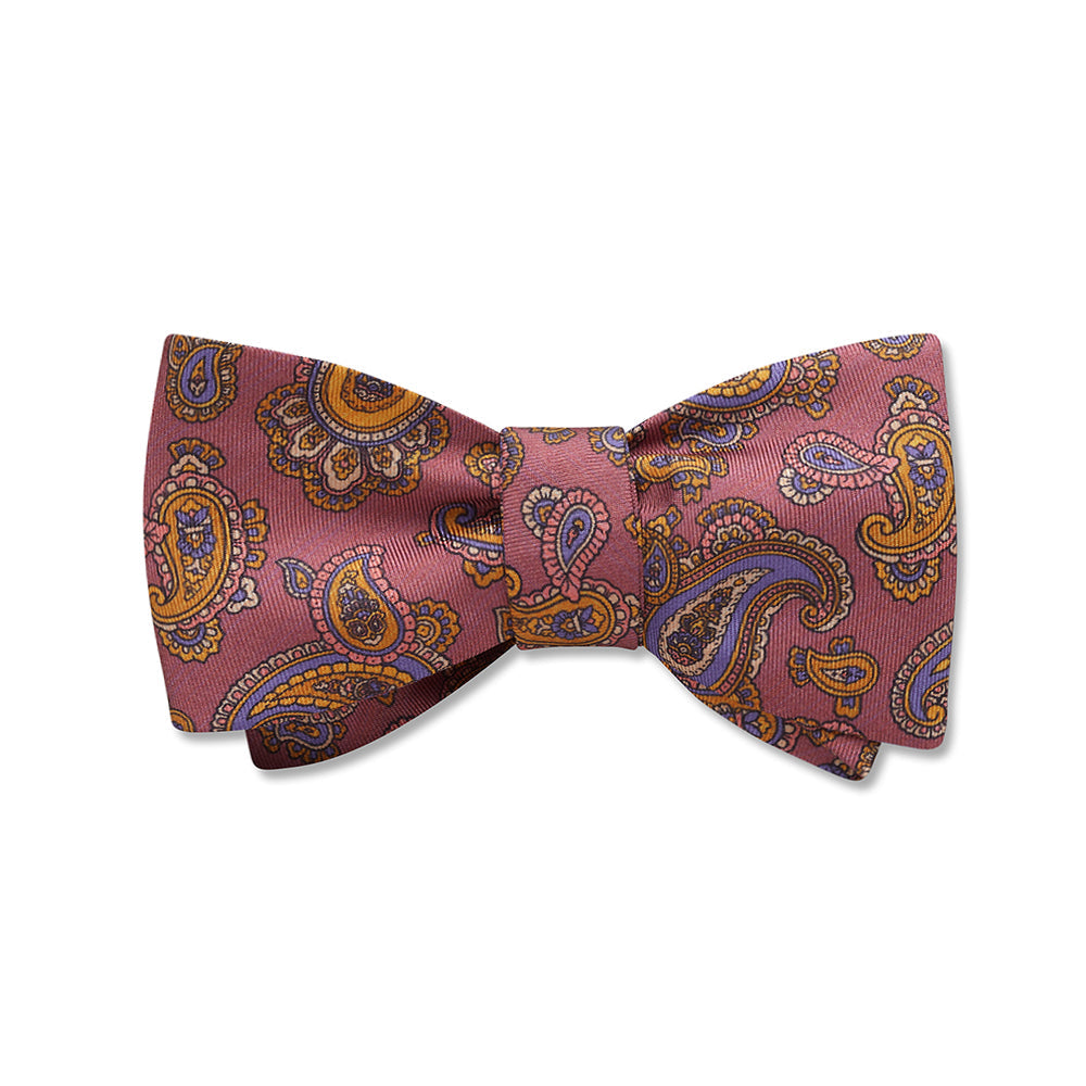 An exquisite shade of dusky pink Italian silk hosts whirls and twirls of gold, pink and blue paisleys in this lovely choice.