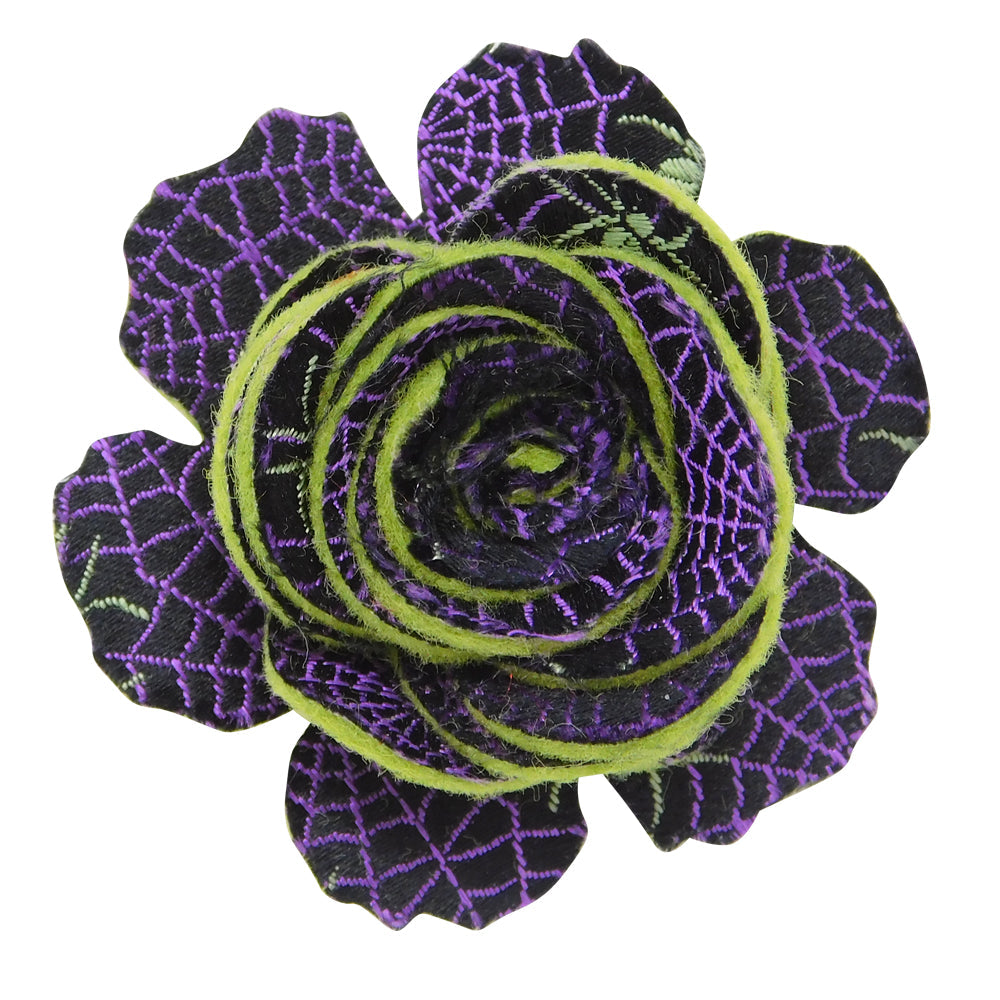 This cheerful boutonniere will not wilt or fade after you've tucked it into your lapel. Golden spiders are busily weaving beautiful purple webs on this deep black woven silk backed with hand cut moss green wool felt, and finished with a pin to anchor it to your jacket.