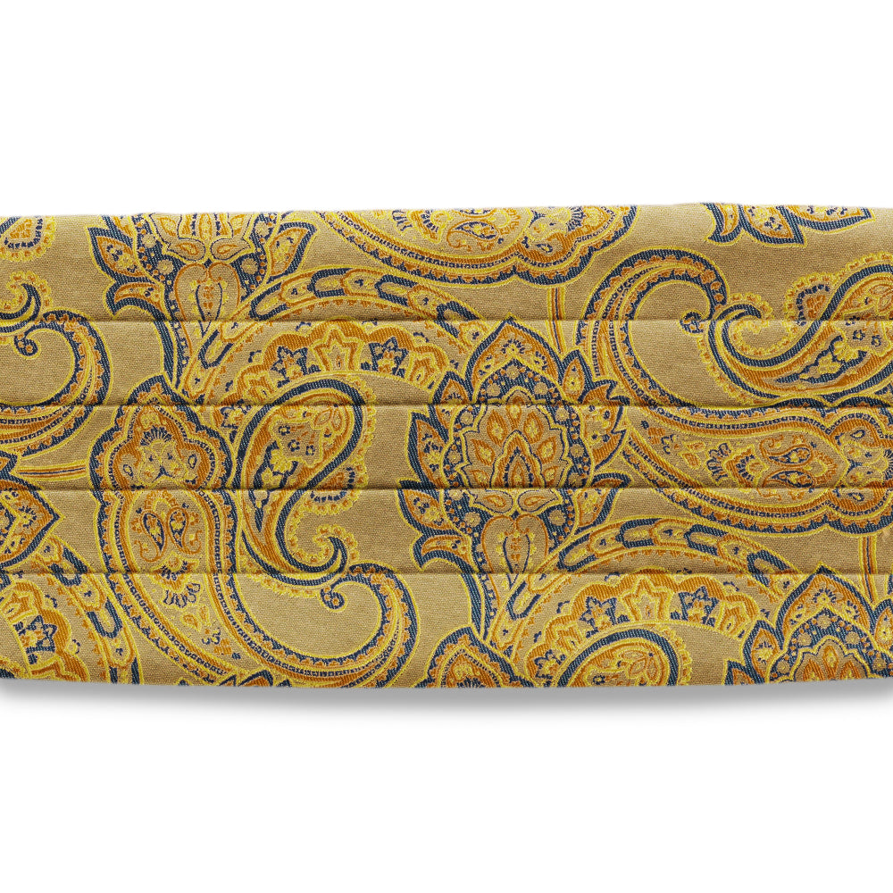 Big looping paisley and floral icons, bound together with stylized links, all in shades of blue and yellow, are woven into deep gold silk in this luscious new take on a traditional design.