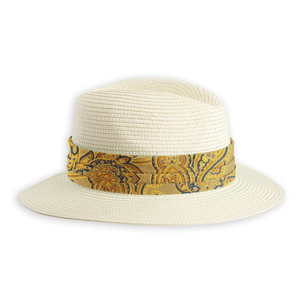 Our handmade hat bands are 29 inches long, 1.75 inches wide, feature stylish pleats, and are finished with small fabric picks, so they're adjustable in size and easy to move from one hat to another. A snazzy addition to your head gear