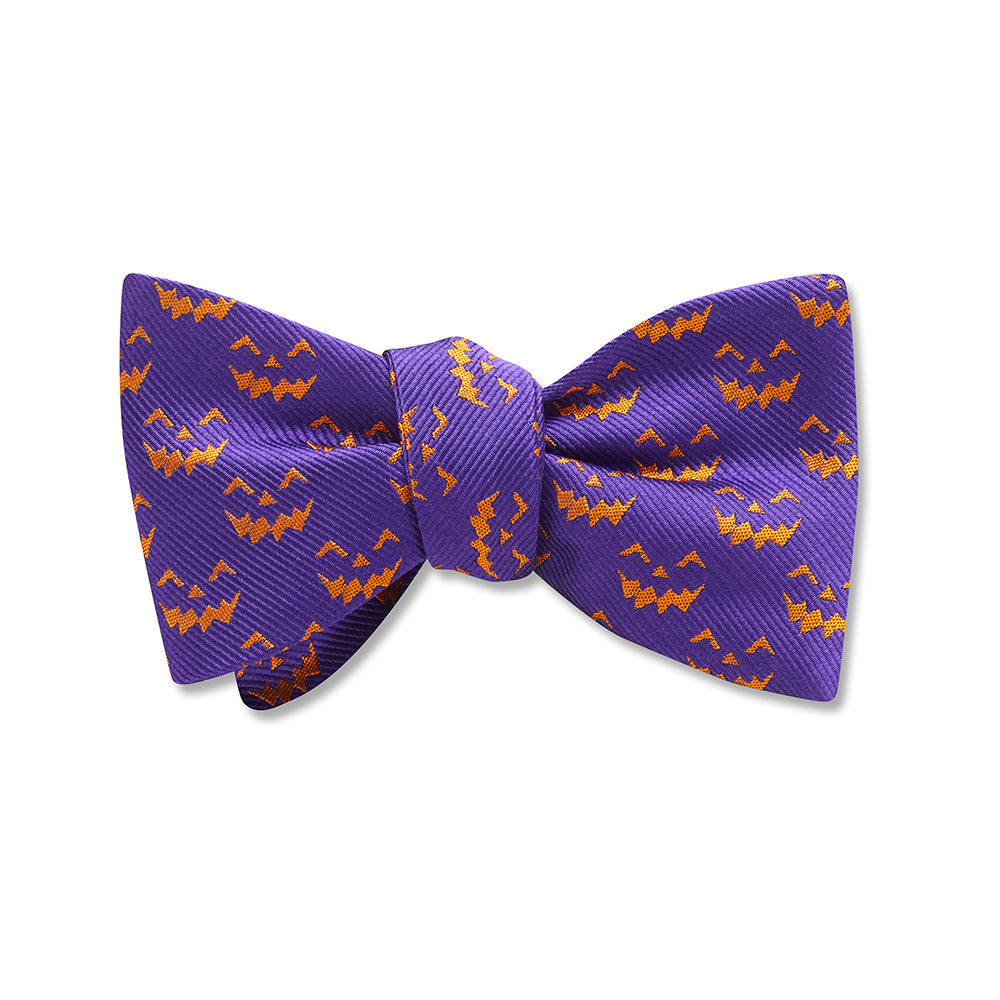 We think this vivid purple woven silk featuring a repeating pattern of orange carved pumpkin faces is a Halloween treat!