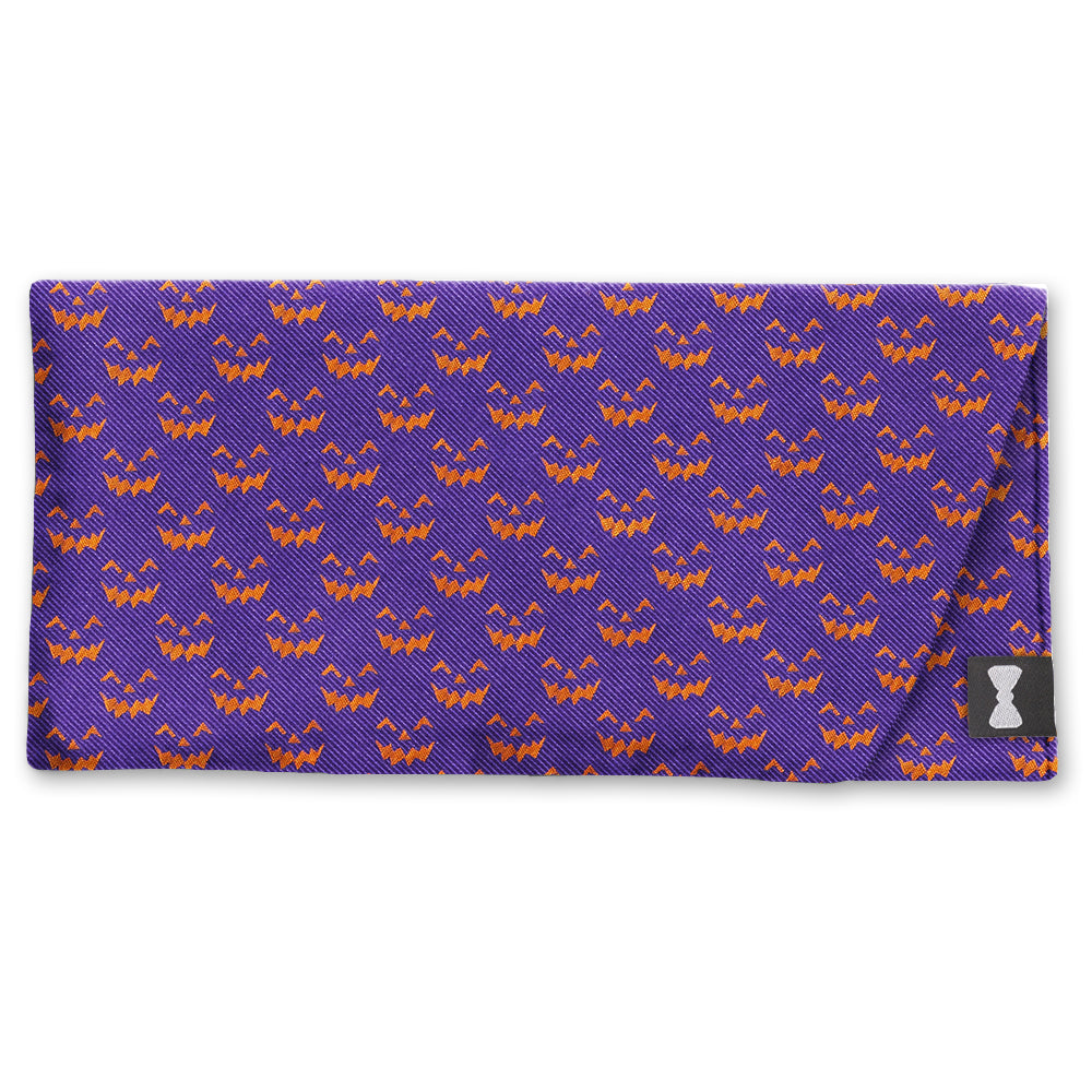 We think this vivid purple woven silk featuring a repeating pattern of orange carved pumpkin faces is a Halloween treat!