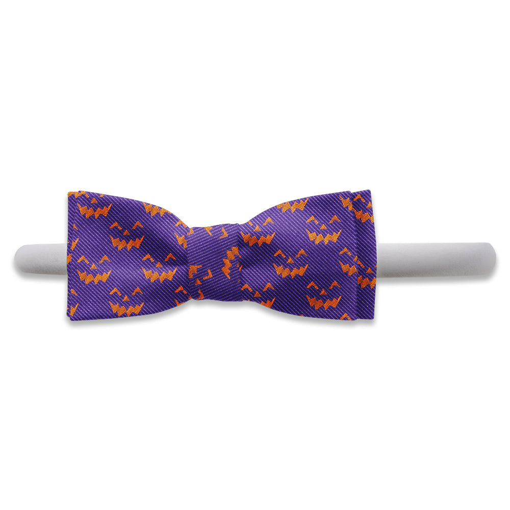 We think this vivid purple woven silk featuring a repeating pattern of orange carved pumpkin faces is a Halloween treat!